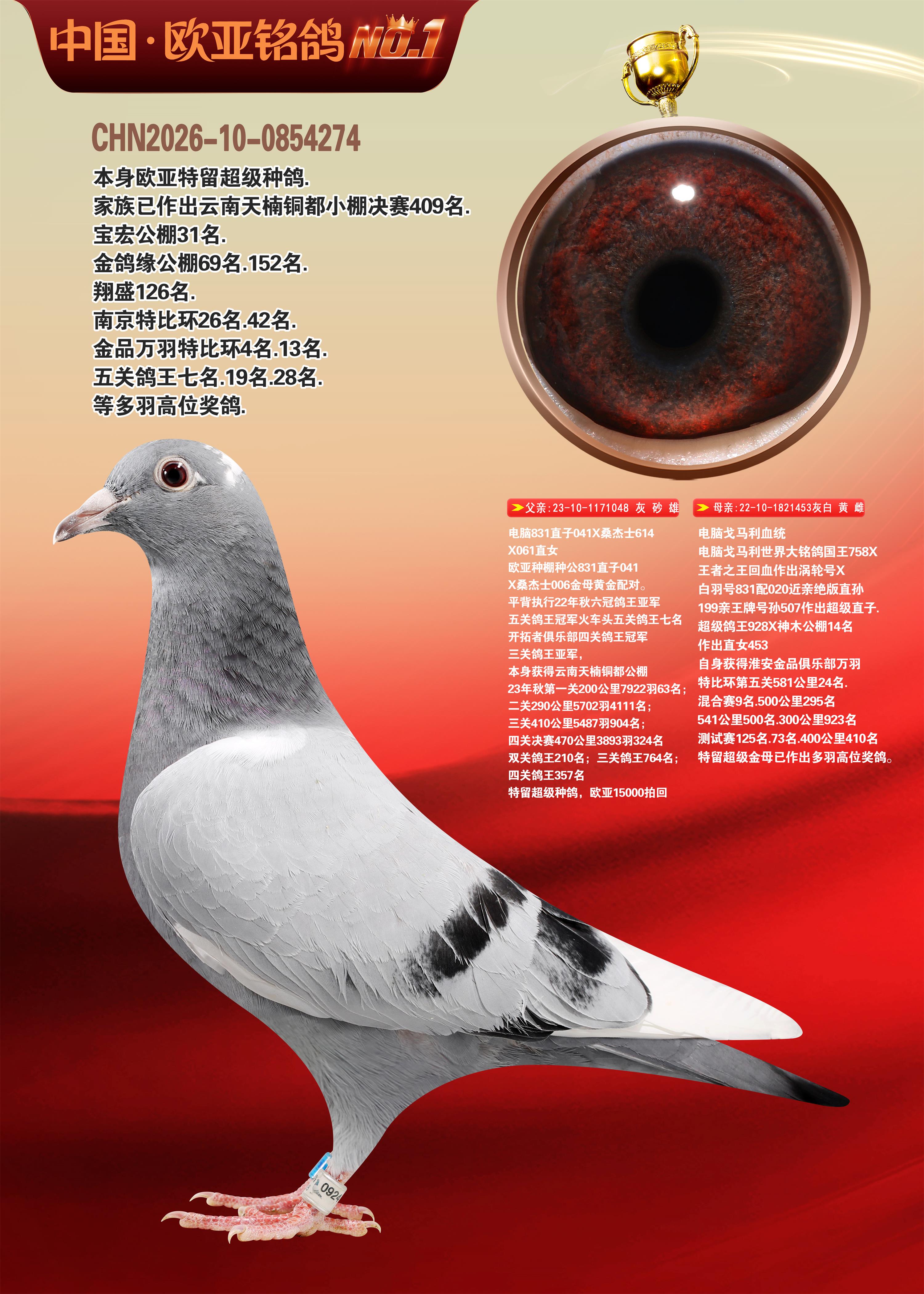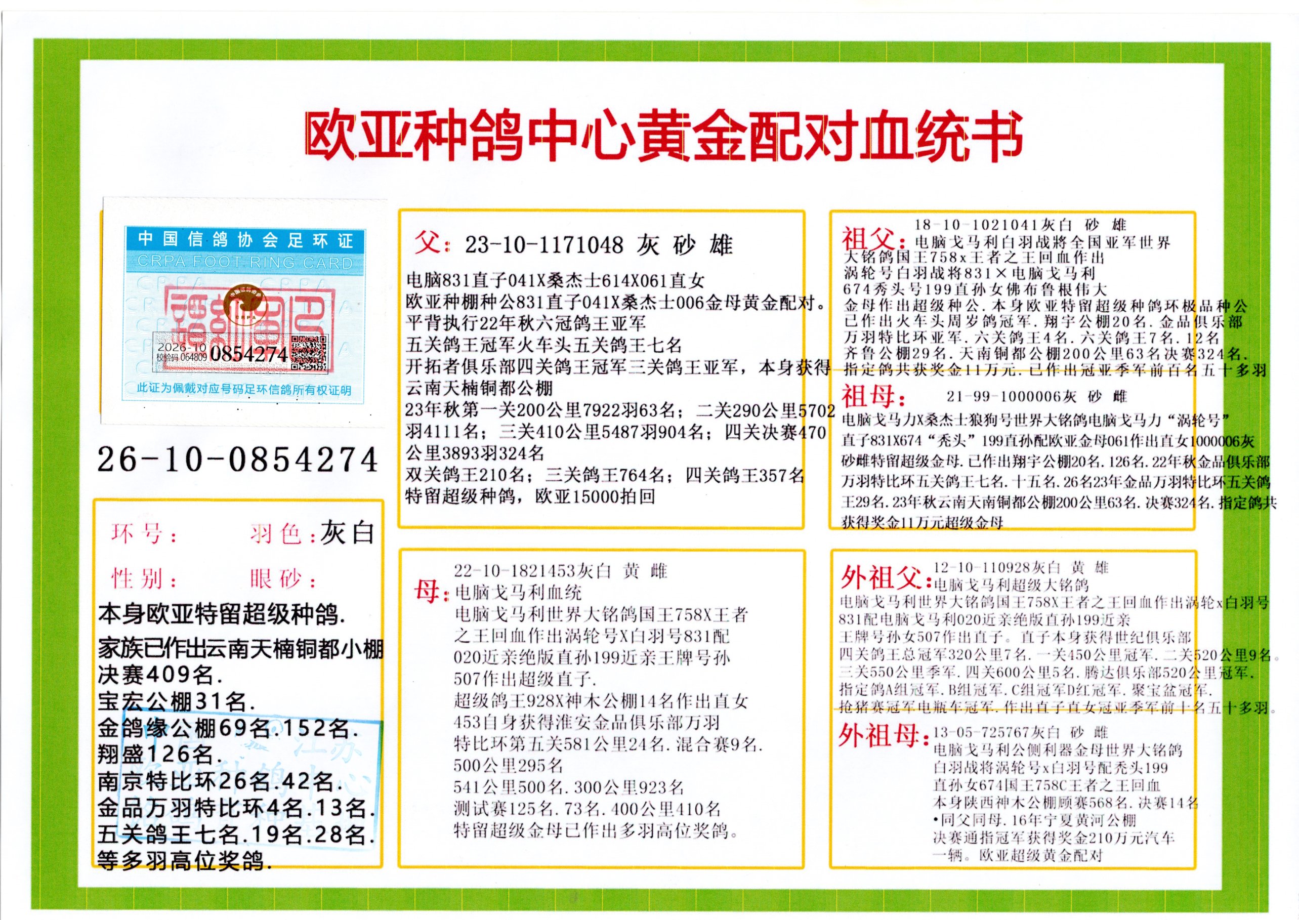 24年秋南京特比环欧亚荣获大团体冠军.小团体冠军551公里大特比13名.14名.16名.19名.20名.21名.24名.26名.27名.28名.42名.52名.54名.57名.65名.66名.68名.70名.71名.72名.74名.76名.80名.82名.83名.84名.85名.86名.90名.92名.110名.116名.121名.122名.128名.131名.158名.161名.164名.165名.166名.172名.174名.177名.182名.195名.196名.201名.205名.208名.210名.216名.253名.269名.275名.276名.294名.296名.299名,,24年秋云南天南铜都公棚决赛415名.天南铜都小棚决赛409名.云南玉活公棚决赛102名.490名.团体32名上笼二羽进二羽,天南铜都大棚506公里决赛445名。热烈祝贺河北省巨鹿县李兰生老师用欧亚泰山号血系连续十一年夺冠军,河北省国家赛冠军.全国季军等多次前十名高位,扬州王军王总用欧亚利奥24年春季获山东翔宇公棚决赛33名盖比53名。南京刘正龙刘总用欧亚盖比获得24年秋山东潍坊国际公棚决赛42名.精英赛30名.三关鸽王71名.决赛86名.加站赛16名.南京市特比环A组鸽王9名.B组鸽王5名.6名.C组鸽王5名.精英赛冠军4名.技能赛A组冠军4名.5名.秦淮区特比环荣获15名.46名.48名.87名。四川西昌徐亮徐总用欧亚利奥获得凉山州聚友决赛177名.第二关亚军双关鸽王19名.三关鸽王105名.云南豪庭公棚决赛603名。热烈祝贺24年四川重庆翔园鸽舍用欧亚泰山号荣获春季400公里冠军.秋季500公里冠军,河北王总用詹森X利奥获得千羽千翔公棚400公里冠军,广东蔡楷焕荣获24年秋爱好者 赛鸽俱乐部三关鸽王季军.一关420公里99名.二关450公里11名.三关520公里32名.单关季军.7名.12名,江西李卫兴荣获贵州红枫公棚8名.共翔俱乐部寄养棚四关综合鸽王30名.一关400公里78名.二关500公里55名.三关520公里37名.四关500公里57名.同父母获公棚18名.雷鸣获得武汉黄浦育翔中心冠军,四川陈文获得四川明鸿俱乐部300公里梦幻2名.3名.4名.9名.10名.13名.14名.15名.31名.34名.40名.41名.42名.43名.69名.71名.72名.73名.74名.94名.95名.97名.98名.99名.419公里决赛荣获总冠军7名.总共归巢9羽,四川徐亮获豪庭决赛603名,山西郑勇获得山西泰鑫公棚决赛255名詹森红狐,热烈祝贺马总获得开尔(飞跃队)决赛9名获奖金1310000万元.第一关52名,天津津福资赛180公里96名.获奖金429543万元,欧亚支持全国鸽友24年秋多人报喜 祝大家取得更好成绩,给欧亚报喜鸽友欧亚决定给每人赠送一羽超级种鸽。欧亚俱乐部特比环多关鸽王成绩:15年秋淮安特比环黑色星期一全会上笼9700多羽,当天无鸽归巢,第二天全会归巢357羽,本舍归巢158羽.前十名八羽.前一百名归巢57羽,16年春季获五关鸽王总冠军,总亚军四名.六名.七名.九名.十名.晶艺俱乐部520公里冠亚季军5名.6名.7名.9名.11名等,火车头冠军.季军6名.8名.9名.10名,16年秋晶艺俱乐部特比环520公里亚军.季军4名.6名.7名.9名,15年春南京白下特比环冠军.亚军.季军6名.7名.8名.9名.10名.指定鸽A B组获得冠军.亚军.季军4名.5名.,17年淮安特比环亚军.4名.5名.7名.8名.10名.六关鸽王总冠军.4名.6名.9名.10名,寄养棚宿迁刘总20羽特比环获冠军.季军.4名.7名.8名.9名等。18年荣获万羽特比环六关鸽王总冠军.总亚军.总季军.6名.8名.十名.单关四羽冠军.二羽亚军.四羽季军.前十名27羽。19年秋万羽特比环六关鸽王总亚军.总季军.5名.8名等,单关二羽冠军.三羽亚军.一羽季军前十名31羽。20年秋淮安市鸽会四关特比环大赛风雨无阻鸽王亚军.鸽王六名,金品俱乐部万羽特比环六关鸽王总冠军,总亚军.四名.五名.六名.七名.八名.十名.前二百名鸽王35羽,单关冠亚季军前十名四十多羽,火车头五关鸽王季军.六名.八名.前二百名鸽王十七羽。20年春荣获淮安五区一市四关鸽王总冠军.亚军.四名.八名.九名。21年秋荣获金品万羽特比环大赛六关鸽王总亚军.总季军.四名.七名.九名.十名.单关冠亚军季军前十名三十多羽。火车头协会鸽王六名.七名.十名.单关前十名十七羽。22年秋荣获鸽王总冠军.总亚军.5名.7名.8名.9名.11名.单关冠亚季军前十名三十多羽,第一关单关前二百名四十多羽,第二关前二百名三十多羽,第三关前二百名四十多羽,第四关前二百名四十多羽,第五关前一百名53羽。23年秋荣获鸽王季军.五名.八名.十名.13名.17名.20名.27名等多羽鸽王.单关前十名二十多羽。公棚.寄养棚部分成绩:16年秋宁夏黄河公棚总冠军电脑戈马力指定通炮冠军,17年送八羽参赛获得鸽王八名进奖四名,支持韩总荣获八名。支持鸽友荣获宁夏中卫公棚决赛总冠军.精英赛冠军,支持18年宁夏黄河公棚决赛冠军詹森X泰山。安徽鼎博寄养棚院内外四关鸽王总冠军.鸽王十七名.三十七名同窝,鸽王39名.42名.58名.67名。18年山东公棚预赛冠军.决赛65名.送八羽进奖五羽.指定获奔驰汽车一辆。支持鸽友获得云南蓝云公棚冠军.盖比X佛卡门。支持鸽友荣获云南银集公棚决赛冠军 詹森427X520血系 速度赛6700羽冠军。17年荣获金马俱乐部寄养棚四关鸽王总冠军.季军.六名.八名.第一关冠军.亚军.季军四名.七名.十一名.金牌教练奖。支持鸽友18年北京费翔公棚预赛九名电脑X桑杰士,支持鸽友荣获陕西威力公棚决赛11名.内蒙古临河寄养棚四关鸽王六名.詹森配泰山,支持河北王总用欧亚詹森427配胡本喜获20年秋开尔青年棚季军。云南东荣公棚16年预赛冠军.决赛77名.17年决赛12名.詹森红狐X泰山,17年平安公棚决赛4名 詹森427。欧亚获得21年金母寄养棚第一关四名.第二关5名.第三关5名.6名.7名.10名.三关鸽王总冠军,四关鸽王14名.十羽鸽王。支持河