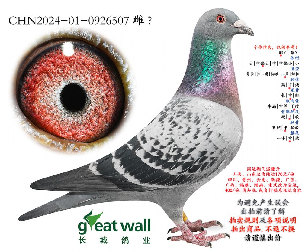 因拍卖鸽均是未做育过的种鸽或幼鸽,图内所标雌雄仅供参考,实际性别已实物为准。不做退换理由。