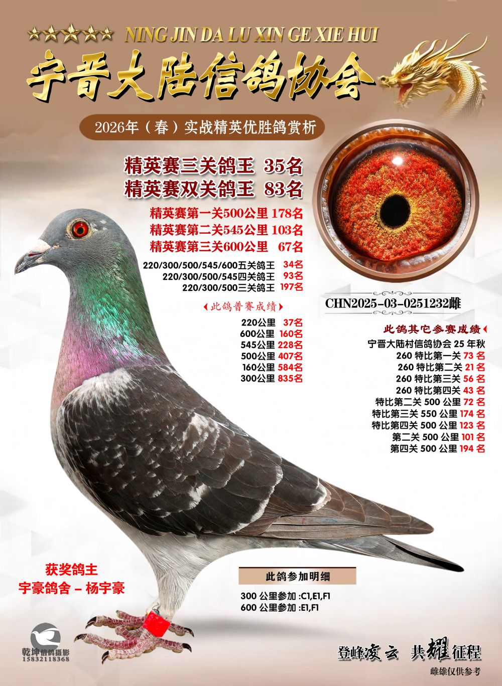 部分偏远地区的鸽友请在拍鸽前先联系拍卖方确认是否可以发鸽,联系电话:13930973375