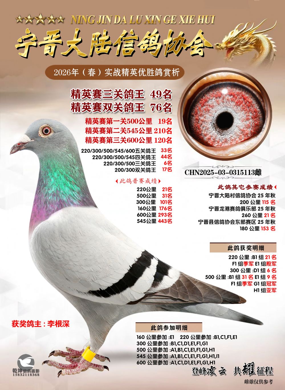 部分偏远地区的鸽友请在拍鸽前先联系拍卖方确认是否可以发鸽,联系电话:13930973375