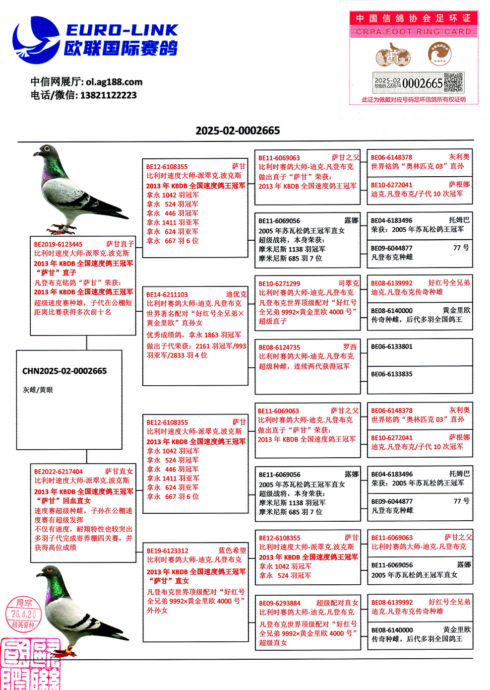 | 1662157 | 世界铭鸽“最佳基特尔”直孙女 | ¥5100元 | 8次 |