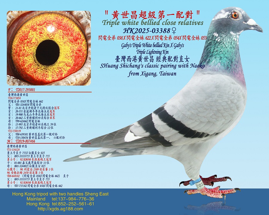 廣東順德鴿友馮有堅先生使翔蓋比白腹號鴿系勇奪三關總冠軍、關關指冠軍、站站指冠軍