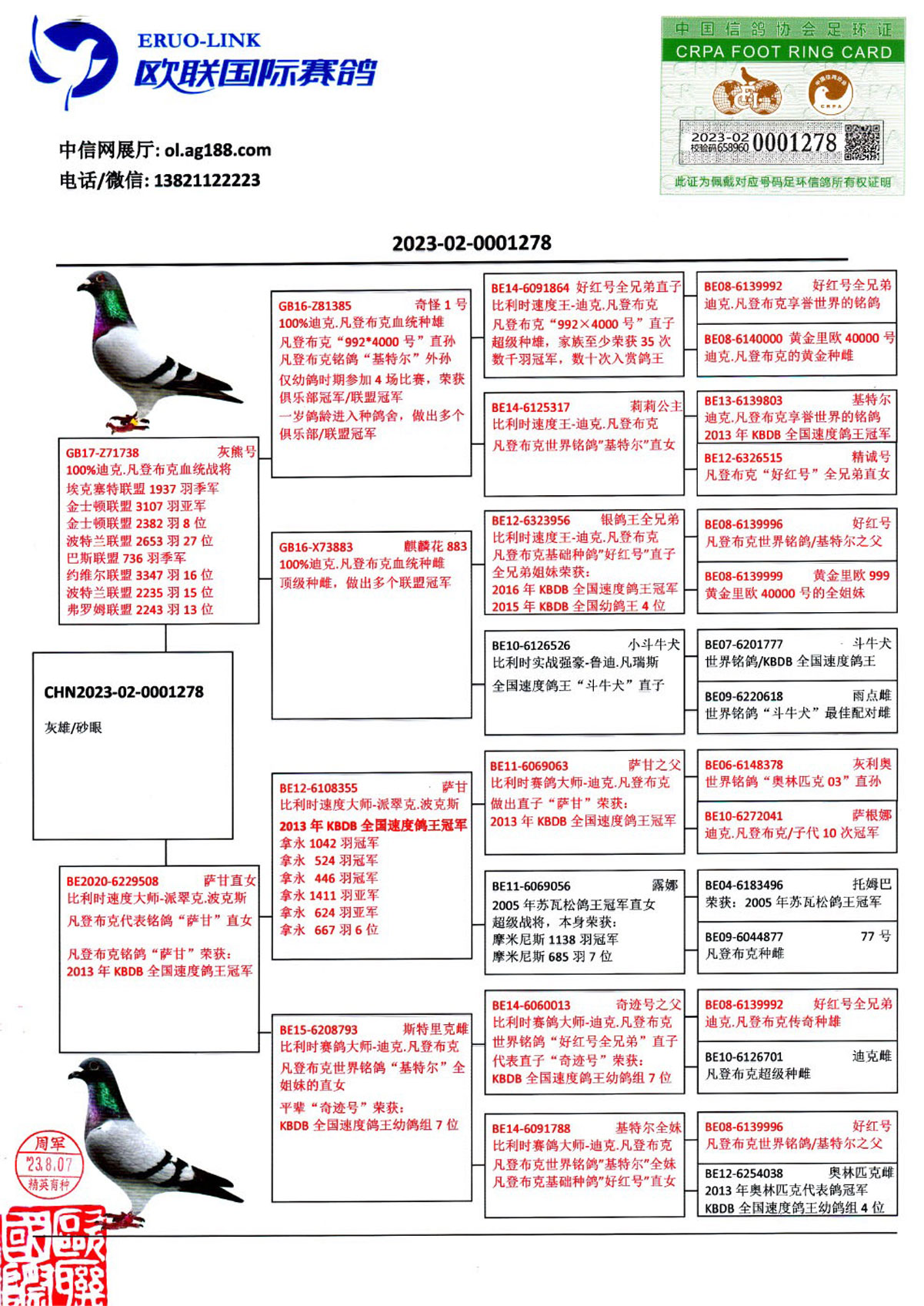 运输费用:采取快递发货,两羽内运费100元,增加一羽增加50元。新疆、海南、西藏地区不能快递运输,特别提醒,新疆发不了快递了,拍前请联系:15833828218