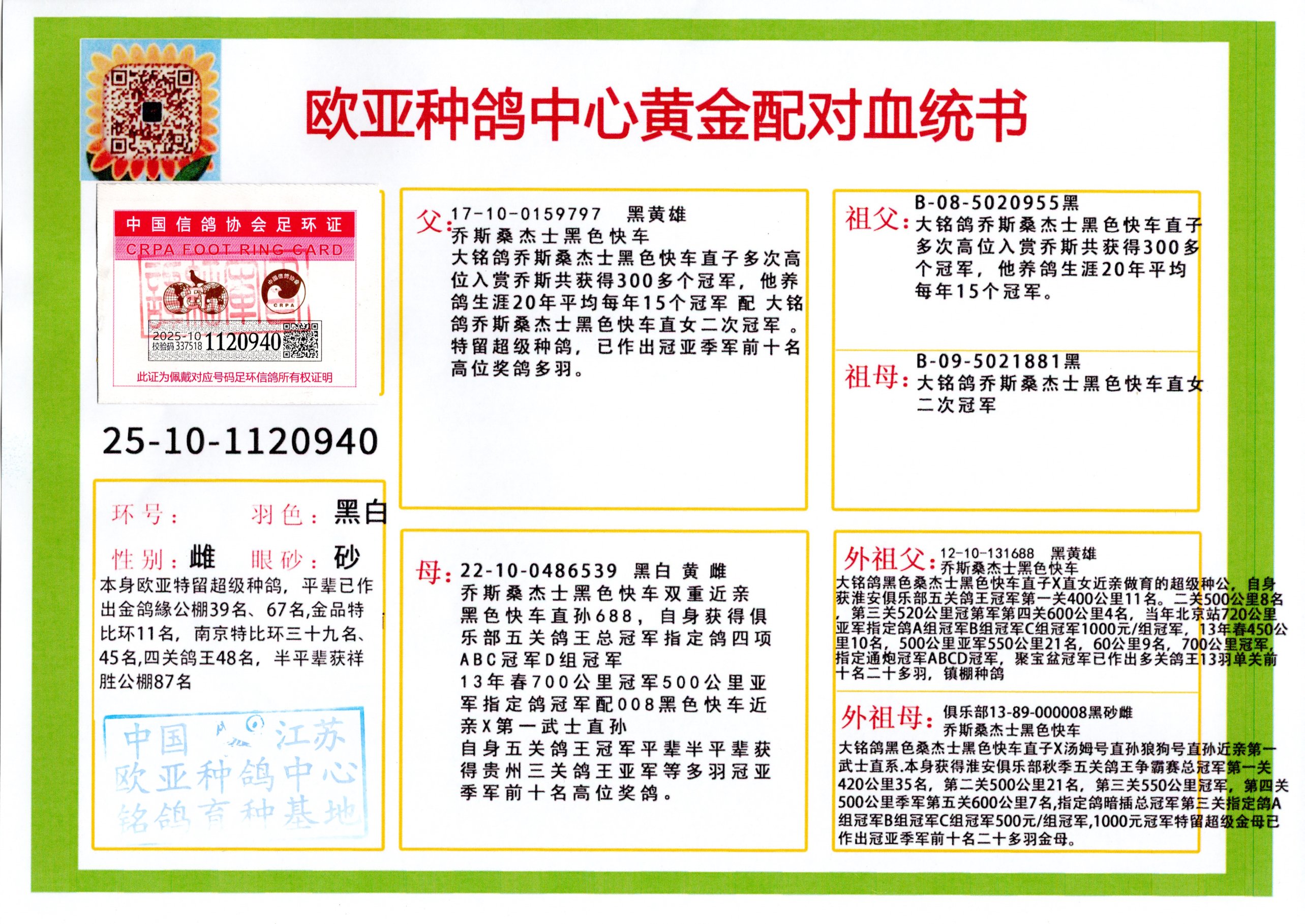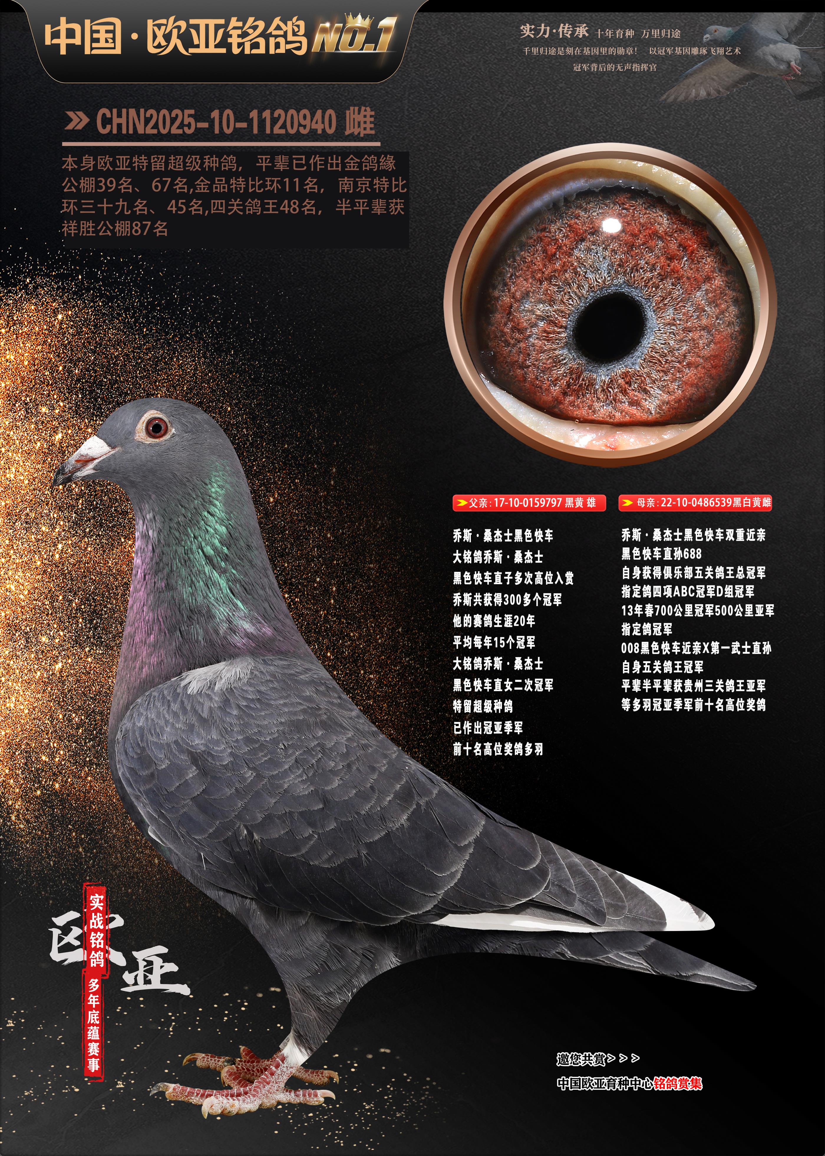 24年秋南京特比环欧亚荣获大团体冠军.小团体冠军551公里大特比13名.14名.16名.19名.20名.21名.24名.26名.27名.28名.42名.52名.54名.57名.65名.66名.68名.70名.71名.72名.74名.76名.80名.82名.83名.84名.85名.86名.90名.92名.110名.116名.121名.122名.128名.131名.158名.161名.164名.165名.166名.172名.174名.177名.182名.195名.196名.201名.205名.208名.210名.216名.253名.269名.275名.276名.294名.296名.299名,,24年秋云南天南铜都公棚决赛415名.天南铜都小棚决赛409名.云南玉活公棚决赛102名.490名.团体32名上笼二羽进二羽,天南铜都大棚506公里决赛445名。热烈祝贺河北省巨鹿县李兰生老师用欧亚泰山号血系连续十一年夺冠军,河北省国家赛冠军.全国季军等多次前十名高位,扬州王军王总用欧亚利奥24年春季获山东翔宇公棚决赛33名盖比53名。南京刘正龙刘总用欧亚盖比获得24年秋山东潍坊国际公棚决赛42名.精英赛30名.三关鸽王71名.决赛86名.加站赛16名.南京市特比环A组鸽王9名.B组鸽王5名.6名.C组鸽王5名.精英赛冠军4名.技能赛A组冠军4名.5名.秦淮区特比环荣获15名.46名.48名.87名。四川西昌徐亮徐总用欧亚利奥获得凉山州聚友决赛177名.第二关亚军双关鸽王19名.三关鸽王105名.云南豪庭公棚决赛603名。热烈祝贺24年四川重庆翔园鸽舍用欧亚泰山号荣获春季400公里冠军.秋季500公里冠军,河北王总用詹森X利奥获得千羽千翔公棚400公里冠军,广东蔡楷焕荣获24年秋爱好者 赛鸽俱乐部三关鸽王季军.一关420公里99名.二关450公里11名.三关520公里32名.单关季军.7名.12名,江西李卫兴荣获贵州红枫公棚8名.共翔俱乐部寄养棚四关综合鸽王30名.一关400公里78名.二关500公里55名.三关520公里37名.四关500公里57名.同父母获公棚18名.雷鸣获得武汉黄浦育翔中心冠军,四川陈文获得四川明鸿俱乐部300公里梦幻2名.3名.4名.9名.10名.13名.14名.15名.31名.34名.40名.41名.42名.43名.69名.71名.72名.73名.74名.94名.95名.97名.98名.99名.419公里决赛荣获总冠军7名.总共归巢9羽,四川徐亮获豪庭决赛603名,山西郑勇获得山西泰鑫公棚决赛255名詹森红狐,热烈祝贺马总获得开尔(飞跃队)决赛9名获奖金1310000万元.第一关52名,天津津福资赛180公里96名.获奖金429543万元,欧亚支持全国鸽友24年秋多人报喜 祝大家取得更好成绩,给欧亚报喜鸽友欧亚决定给每人赠送一羽超级种鸽。欧亚俱乐部特比环多关鸽王成绩:15年秋淮安特比环黑色星期一全会上笼9700多羽,当天无鸽归巢,第二天全会归巢357羽,本舍归巢158羽.前十名八羽.前一百名归巢57羽,16年春季获五关鸽王总冠军,总亚军四名.六名.七名.九名.十名.晶艺俱乐部520公里冠亚季军5名.6名.7名.9名.11名等,火车头冠军.季军6名.8名.9名.10名,16年秋晶艺俱乐部特比环520公里亚军.季军4名.6名.7名.9名,15年春南京白下特比环冠军.亚军.季军6名.7名.8名.9名.10名.指定鸽A B组获得冠军.亚军.季军4名.5名.,17年淮安特比环亚军.4名.5名.7名.8名.10名.六关鸽王总冠军.4名.6名.9名.10名,寄养棚宿迁刘总20羽特比环获冠军.季军.4名.7名.8名.9名等。18年荣获万羽特比环六关鸽王总冠军.总亚军.总季军.6名.8名.十名.单关四羽冠军.二羽亚军.四羽季军.前十名27羽。19年秋万羽特比环六关鸽王总亚军.总季军.5名.8名等,单关二羽冠军.三羽亚军.一羽季军前十名31羽。20年秋淮安市鸽会四关特比环大赛风雨无阻鸽王亚军.鸽王六名,金品俱乐部万羽特比环六关鸽王总冠军,总亚军.四名.五名.六名.七名.八名.十名.前二百名鸽王35羽,单关冠亚季军前十名四十多羽,火车头五关鸽王季军.六名.八名.前二百名鸽王十七羽。20年春荣获淮安五区一市四关鸽王总冠军.亚军.四名.八名.九名。21年秋荣获金品万羽特比环大赛六关鸽王总亚军.总季军.四名.七名.九名.十名.单关冠亚军季军前十名三十多羽。火车头协会鸽王六名.七名.十名.单关前十名十七羽。22年秋荣获鸽王总冠军.总亚军.5名.7名.8名.9名.11名.单关冠亚季军前十名三十多羽,第一关单关前二百名四十多羽,第二关前二百名三十多羽,第三关前二百名四十多羽,第四关前二百名四十多羽,第五关前一百名53羽。23年秋荣获鸽王季军.五名.八名.十名.13名.17名.20名.27名等多羽鸽王.单关前十名二十多羽。公棚.寄养棚部分成绩:16年秋宁夏黄河公棚总冠军电脑戈马力指定通炮冠军,17年送八羽参赛获得鸽王八名进奖四名,支持韩总荣获八名。支持鸽友荣获宁夏中卫公棚决赛总冠军.精英赛冠军,支持18年宁夏黄河公棚决赛冠军詹森X泰山。安徽鼎博寄养棚院内外四关鸽王总冠军.鸽王十七名.三十七名同窝,鸽王39名.42名.58名.67名。18年山东公棚预赛冠军.决赛65名.送八羽进奖五羽.指定获奔驰汽车一辆。支持鸽友获得云南蓝云公棚冠军.盖比X佛卡门。支持鸽友荣获云南银集公棚决赛冠军 詹森427X520血系 速度赛6700羽冠军。17年荣获金马俱乐部寄养棚四关鸽王总冠军.季军.六名.八名.第一关冠军.亚军.季军四名.七名.十一名.金牌教练奖。支持鸽友18年北京费翔公棚预赛九名电脑X桑杰士,支持鸽友荣获陕西威力公棚决赛11名.内蒙古临河寄养棚四关鸽王六名.詹森配泰山,支持河北王总用欧亚詹森427配胡本喜获20年秋开尔青年棚季军。云南东荣公棚16年预赛冠军.决赛77名.17年决赛12名.詹森红狐X泰山,17年平安公棚决赛4名 詹森427。欧亚获得21年金母寄养棚第一关四名.第二关5名.第三关5名.6名.7名.10名.三关鸽王总冠军,四关鸽王14名.十羽鸽王。支持河
