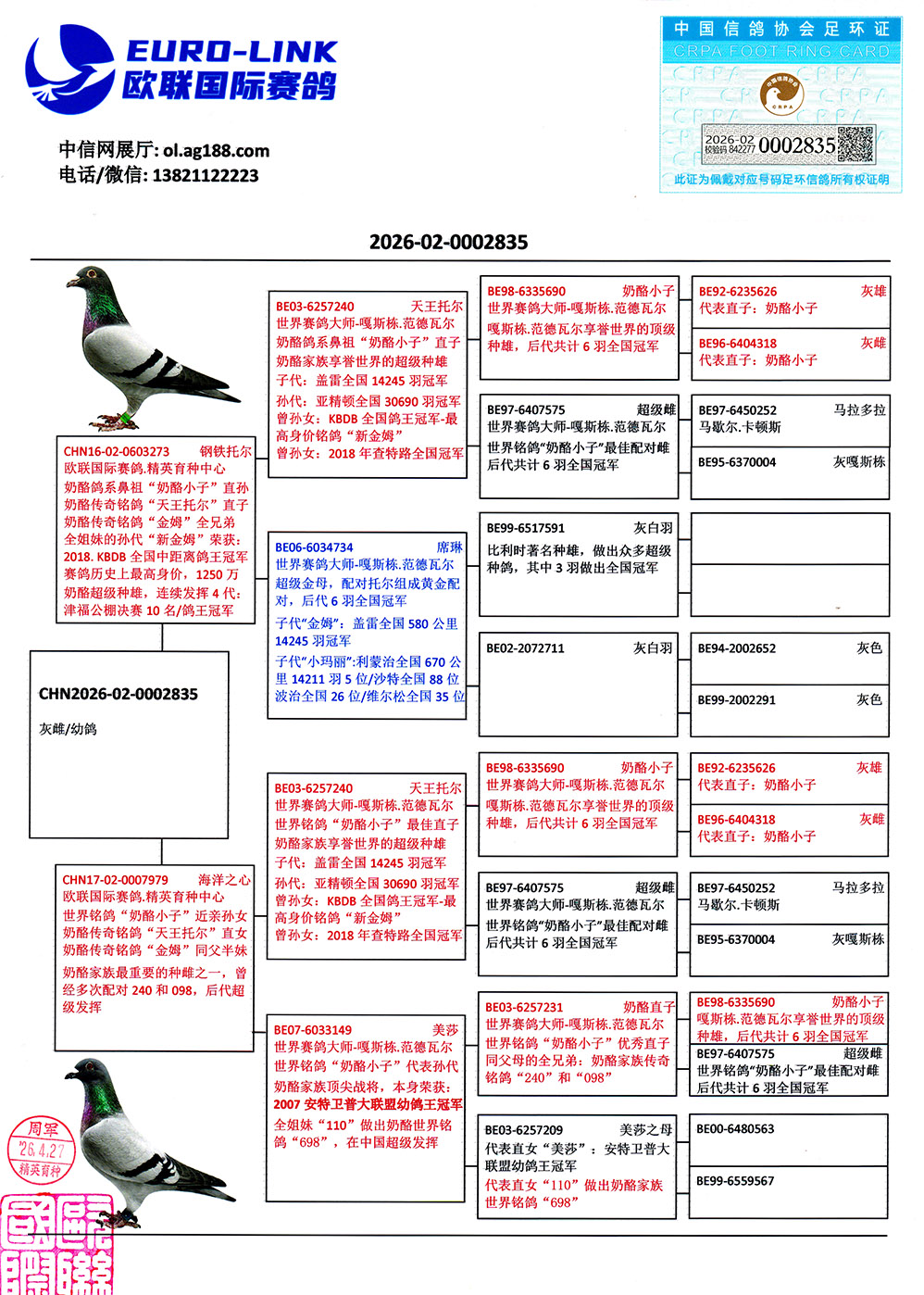 世界铭鸽“240”近亲孙女