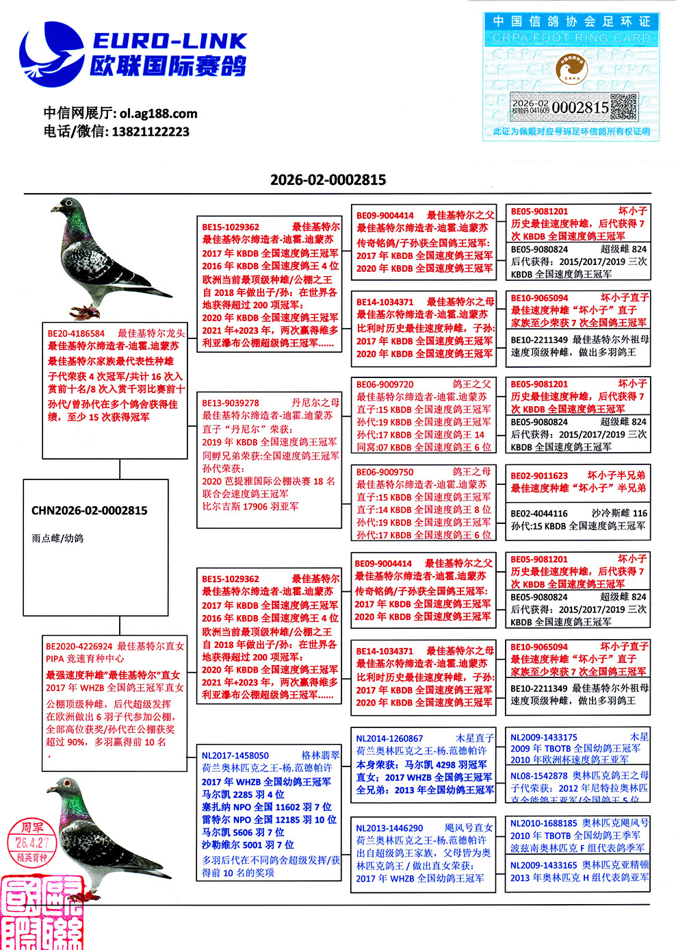 世界铭鸽“最佳基特尔”直子女互配