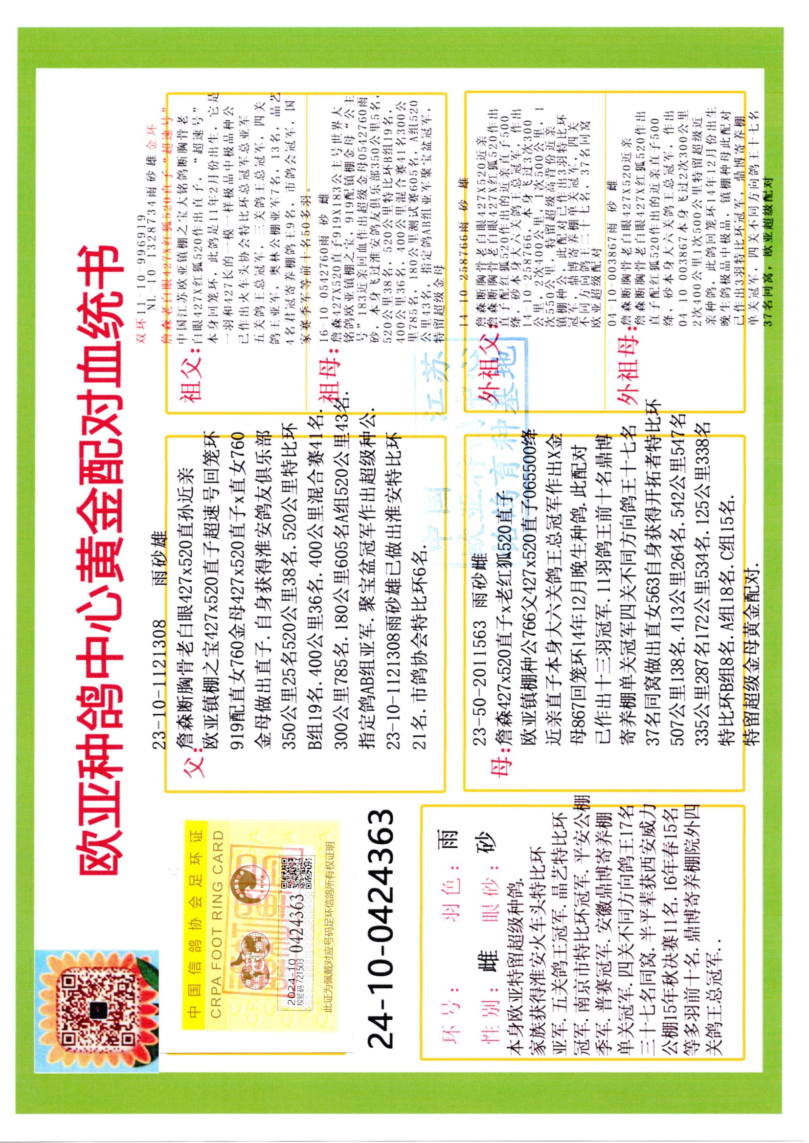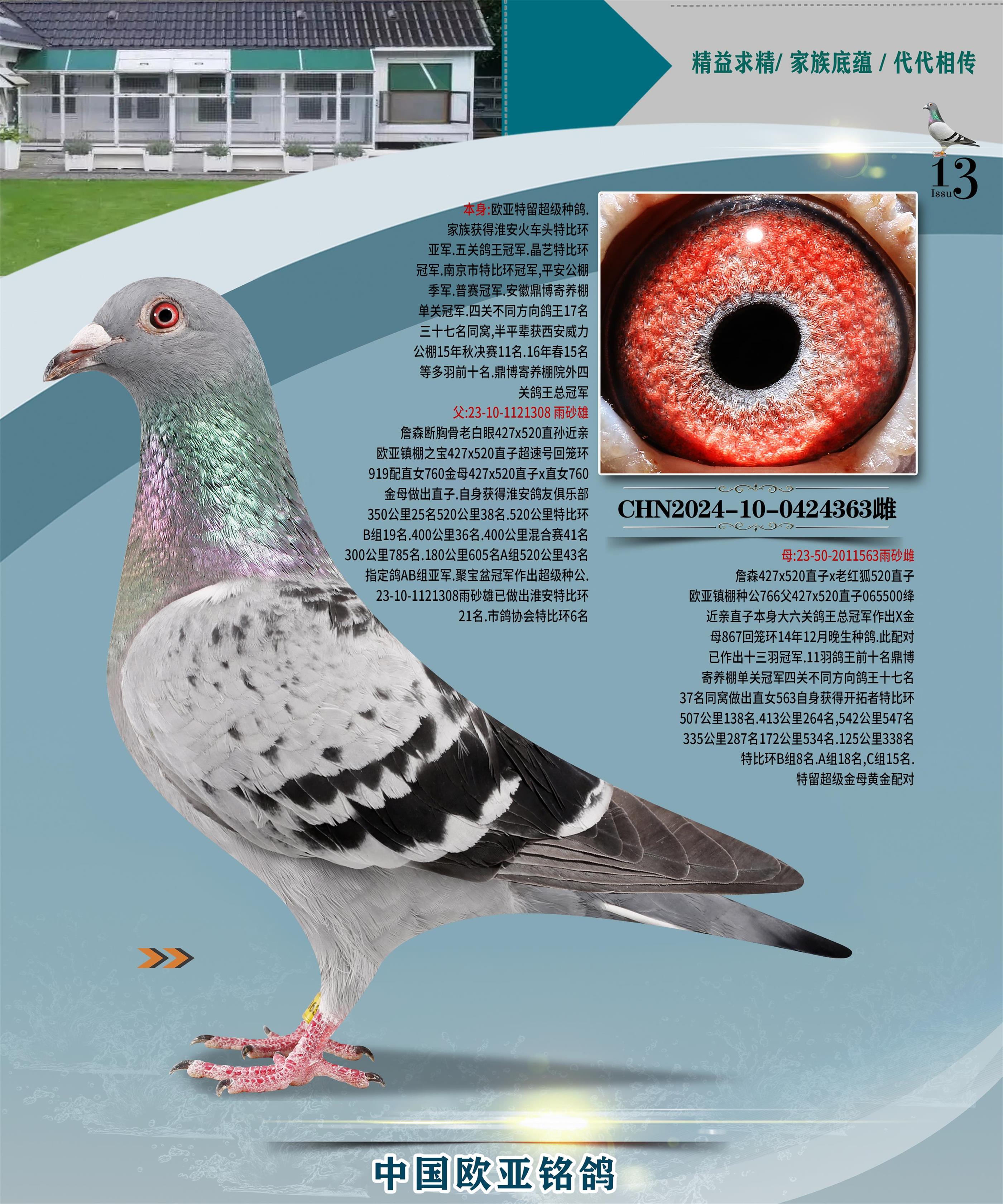 24年秋南京特比环欧亚荣获大团体冠军.小团体冠军551公里大特比13名.14名.16名.19名.20名.21名.24名.26名.27名.28名.42名.52名.54名.57名.65名.66名.68名.70名.71名.72名.74名.76名.80名.82名.83名.84名.85名.86名.90名.92名.110名.116名.121名.122名.128名.131名.158名.161名.164名.165名.166名.172名.174名.177名.182名.195名.196名.201名.205名.208名.210名.216名.253名.269名.275名.276名.294名.296名.299名,,24年秋云南天南铜都公棚决赛415名.天南铜都小棚决赛409名.云南玉活公棚决赛102名.490名.团体32名上笼二羽进二羽,天南铜都大棚506公里决赛445名。热烈祝贺河北省巨鹿县李兰生老师用欧亚泰山号血系连续十一年夺冠军,河北省国家赛冠军.全国季军等多次前十名高位,扬州王军王总用欧亚利奥24年春季获山东翔宇公棚决赛33名盖比53名。南京刘正龙刘总用欧亚盖比获得24年秋山东潍坊国际公棚决赛42名.精英赛30名.三关鸽王71名.决赛86名.加站赛16名.南京市特比环A组鸽王9名.B组鸽王5名.6名.C组鸽王5名.精英赛冠军4名.技能赛A组冠军4名.5名.秦淮区特比环荣获15名.46名.48名.87名。四川西昌徐亮徐总用欧亚利奥获得凉山州聚友决赛177名.第二关亚军双关鸽王19名.三关鸽王105名.云南豪庭公棚决赛603名。热烈祝贺24年四川重庆翔园鸽舍用欧亚泰山号荣获春季400公里冠军.秋季500公里冠军,河北王总用詹森X利奥获得千羽千翔公棚400公里冠军,广东蔡楷焕荣获24年秋爱好者 赛鸽俱乐部三关鸽王季军.一关420公里99名.二关450公里11名.三关520公里32名.单关季军.7名.12名,江西李卫兴荣获贵州红枫公棚8名.共翔俱乐部寄养棚四关综合鸽王30名.一关400公里78名.二关500公里55名.三关520公里37名.四关500公里57名.同父母获公棚18名.雷鸣获得武汉黄浦育翔中心冠军,四川陈文获得四川明鸿俱乐部300公里梦幻2名.3名.4名.9名.10名.13名.14名.15名.31名.34名.40名.41名.42名.43名.69名.71名.72名.73名.74名.94名.95名.97名.98名.99名.419公里决赛荣获总冠军7名.总共归巢9羽,四川徐亮获豪庭决赛603名,山西郑勇获得山西泰鑫公棚决赛255名詹森红狐,热烈祝贺马总获得开尔(飞跃队)决赛9名获奖金1310000万元.第一关52名,天津津福资赛180公里96名.获奖金429543万元,欧亚支持全国鸽友24年秋多人报喜 祝大家取得更好成绩,给欧亚报喜鸽友欧亚决定给每人赠送一羽超级种鸽。欧亚俱乐部特比环多关鸽王成绩:15年秋淮安特比环黑色星期一全会上笼9700多羽,当天无鸽归巢,第二天全会归巢357羽,本舍归巢158羽.前十名八羽.前一百名归巢57羽,16年春季获五关鸽王总冠军,总亚军四名.六名.七名.九名.十名.晶艺俱乐部520公里冠亚季军5名.6名.7名.9名.11名等,火车头冠军.季军6名.8名.9名.10名,16年秋晶艺俱乐部特比环520公里亚军.季军4名.6名.7名.9名,15年春南京白下特比环冠军.亚军.季军6名.7名.8名.9名.10名.指定鸽A B组获得冠军.亚军.季军4名.5名.,17年淮安特比环亚军.4名.5名.7名.8名.10名.六关鸽王总冠军.4名.6名.9名.10名,寄养棚宿迁刘总20羽特比环获冠军.季军.4名.7名.8名.9名等。18年荣获万羽特比环六关鸽王总冠军.总亚军.总季军.6名.8名.十名.单关四羽冠军.二羽亚军.四羽季军.前十名27羽。19年秋万羽特比环六关鸽王总亚军.总季军.5名.8名等,单关二羽冠军.三羽亚军.一羽季军前十名31羽。20年秋淮安市鸽会四关特比环大赛风雨无阻鸽王亚军.鸽王六名,金品俱乐部万羽特比环六关鸽王总冠军,总亚军.四名.五名.六名.七名.八名.十名.前二百名鸽王35羽,单关冠亚季军前十名四十多羽,火车头五关鸽王季军.六名.八名.前二百名鸽王十七羽。20年春荣获淮安五区一市四关鸽王总冠军.亚军.四名.八名.九名。21年秋荣获金品万羽特比环大赛六关鸽王总亚军.总季军.四名.七名.九名.十名.单关冠亚军季军前十名三十多羽。火车头协会鸽王六名.七名.十名.单关前十名十七羽。22年秋荣获鸽王总冠军.总亚军.5名.7名.8名.9名.11名.单关冠亚季军前十名三十多羽,第一关单关前二百名四十多羽,第二关前二百名三十多羽,第三关前二百名四十多羽,第四关前二百名四十多羽,第五关前一百名53羽。23年秋荣获鸽王季军.五名.八名.十名.13名.17名.20名.27名等多羽鸽王.单关前十名二十多羽。公棚.寄养棚部分成绩:16年秋宁夏黄河公棚总冠军电脑戈马力指定通炮冠军,17年送八羽参赛获得鸽王八名进奖四名,支持韩总荣获八名。支持鸽友荣获宁夏中卫公棚决赛总冠军.精英赛冠军,支持18年宁夏黄河公棚决赛冠军詹森X泰山。安徽鼎博寄养棚院内外四关鸽王总冠军.鸽王十七名.三十七名同窝,鸽王39名.42名.58名.67名。18年山东公棚预赛冠军.决赛65名.送八羽进奖五羽.指定获奔驰汽车一辆。支持鸽友获得云南蓝云公棚冠军.盖比X佛卡门。支持鸽友荣获云南银集公棚决赛冠军 詹森427X520血系 速度赛6700羽冠军。17年荣获金马俱乐部寄养棚四关鸽王总冠军.季军.六名.八名.第一关冠军.亚军.季军四名.七名.十一名.金牌教练奖。支持鸽友18年北京费翔公棚预赛九名电脑X桑杰士,支持鸽友荣获陕西威力公棚决赛11名.内蒙古临河寄养棚四关鸽王六名.詹森配泰山,支持河北王总用欧亚詹森427配胡本喜获20年秋开尔青年棚季军。云南东荣公棚16年预赛冠军.决赛77名.17年决赛12名.詹森红狐X泰山,17年平安公棚决赛4名 詹森427。欧亚获得21年金母寄养棚第一关四名.第二关5名.第三关5名.6名.7名.10名.三关鸽王总冠军,四关鸽王14名.十羽鸽王。支持河