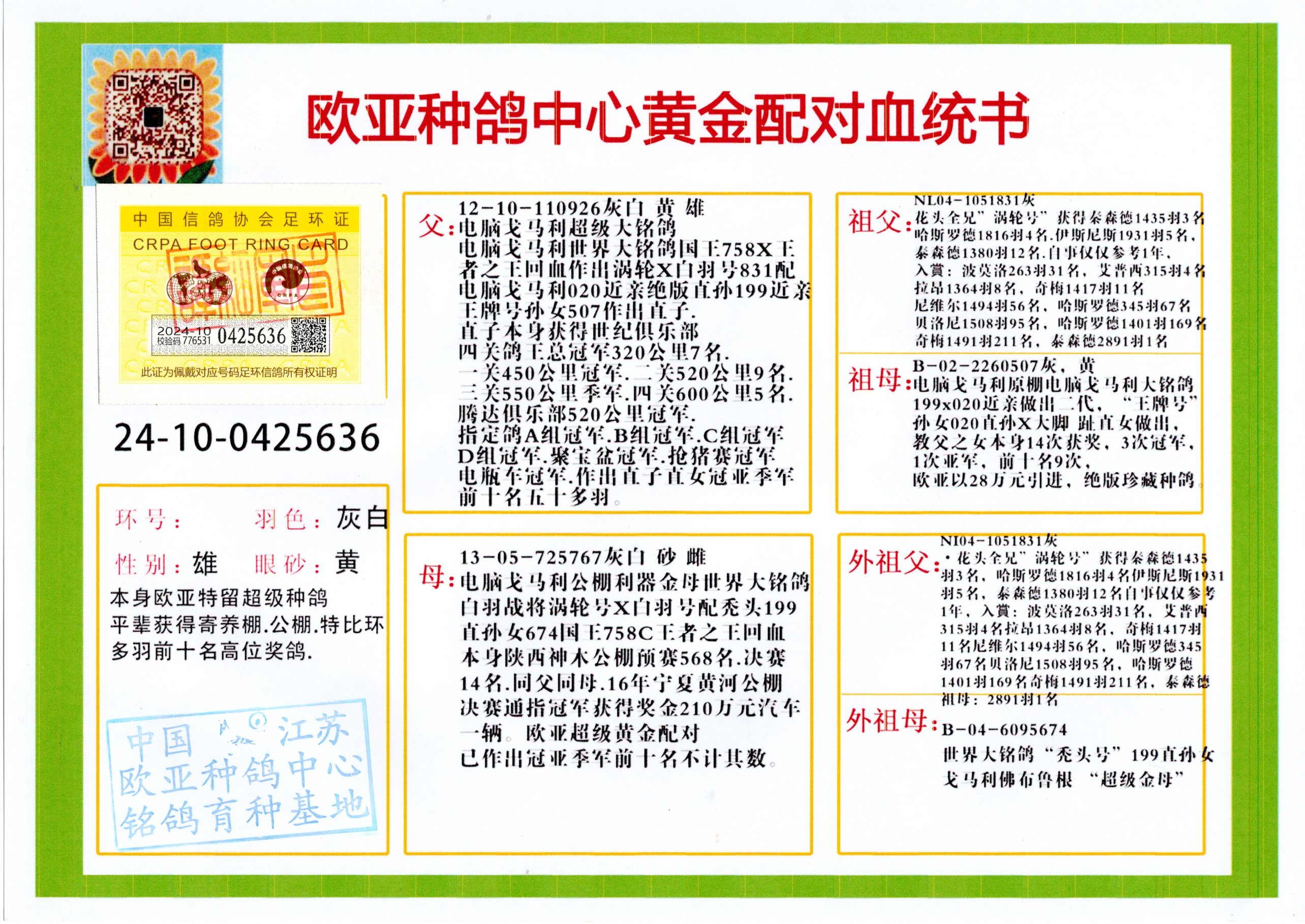 24年秋南京特比环欧亚荣获大团体冠军.小团体冠军551公里大特比13名.14名.16名.19名.20名.21名.24名.26名.27名.28名.42名.52名.54名.57名.65名.66名.68名.70名.71名.72名.74名.76名.80名.82名.83名.84名.85名.86名.90名.92名.110名.116名.121名.122名.128名.131名.158名.161名.164名.165名.166名.172名.174名.177名.182名.195名.196名.201名.205名.208名.210名.216名.253名.269名.275名.276名.294名.296名.299名,,24年秋云南天南铜都公棚决赛415名.天南铜都小棚决赛409名.云南玉活公棚决赛102名.490名.团体32名上笼二羽进二羽,天南铜都大棚506公里决赛445名。热烈祝贺河北省巨鹿县李兰生老师用欧亚泰山号血系连续十一年夺冠军,河北省国家赛冠军.全国季军等多次前十名高位,扬州王军王总用欧亚利奥24年春季获山东翔宇公棚决赛33名盖比53名。南京刘正龙刘总用欧亚盖比获得24年秋山东潍坊国际公棚决赛42名.精英赛30名.三关鸽王71名.决赛86名.加站赛16名.南京市特比环A组鸽王9名.B组鸽王5名.6名.C组鸽王5名.精英赛冠军4名.技能赛A组冠军4名.5名.秦淮区特比环荣获15名.46名.48名.87名。四川西昌徐亮徐总用欧亚利奥获得凉山州聚友决赛177名.第二关亚军双关鸽王19名.三关鸽王105名.云南豪庭公棚决赛603名。热烈祝贺24年四川重庆翔园鸽舍用欧亚泰山号荣获春季400公里冠军.秋季500公里冠军,河北王总用詹森X利奥获得千羽千翔公棚400公里冠军,广东蔡楷焕荣获24年秋爱好者 赛鸽俱乐部三关鸽王季军.一关420公里99名.二关450公里11名.三关520公里32名.单关季军.7名.12名,江西李卫兴荣获贵州红枫公棚8名.共翔俱乐部寄养棚四关综合鸽王30名.一关400公里78名.二关500公里55名.三关520公里37名.四关500公里57名.同父母获公棚18名.雷鸣获得武汉黄浦育翔中心冠军,四川陈文获得四川明鸿俱乐部300公里梦幻2名.3名.4名.9名.10名.13名.14名.15名.31名.34名.40名.41名.42名.43名.69名.71名.72名.73名.74名.94名.95名.97名.98名.99名.419公里决赛荣获总冠军7名.总共归巢9羽,四川徐亮获豪庭决赛603名,山西郑勇获得山西泰鑫公棚决赛255名詹森红狐,热烈祝贺马总获得开尔(飞跃队)决赛9名获奖金1310000万元.第一关52名,天津津福资赛180公里96名.获奖金429543万元,欧亚支持全国鸽友24年秋多人报喜 祝大家取得更好成绩,给欧亚报喜鸽友欧亚决定给每人赠送一羽超级种鸽。欧亚俱乐部特比环多关鸽王成绩:15年秋淮安特比环黑色星期一全会上笼9700多羽,当天无鸽归巢,第二天全会归巢357羽,本舍归巢158羽.前十名八羽.前一百名归巢57羽,16年春季获五关鸽王总冠军,总亚军四名.六名.七名.九名.十名.晶艺俱乐部520公里冠亚季军5名.6名.7名.9名.11名等,火车头冠军.季军6名.8名.9名.10名,16年秋晶艺俱乐部特比环520公里亚军.季军4名.6名.7名.9名,15年春南京白下特比环冠军.亚军.季军6名.7名.8名.9名.10名.指定鸽A B组获得冠军.亚军.季军4名.5名.,17年淮安特比环亚军.4名.5名.7名.8名.10名.六关鸽王总冠军.4名.6名.9名.10名,寄养棚宿迁刘总20羽特比环获冠军.季军.4名.7名.8名.9名等。18年荣获万羽特比环六关鸽王总冠军.总亚军.总季军.6名.8名.十名.单关四羽冠军.二羽亚军.四羽季军.前十名27羽。19年秋万羽特比环六关鸽王总亚军.总季军.5名.8名等,单关二羽冠军.三羽亚军.一羽季军前十名31羽。20年秋淮安市鸽会四关特比环大赛风雨无阻鸽王亚军.鸽王六名,金品俱乐部万羽特比环六关鸽王总冠军,总亚军.四名.五名.六名.七名.八名.十名.前二百名鸽王35羽,单关冠亚季军前十名四十多羽,火车头五关鸽王季军.六名.八名.前二百名鸽王十七羽。20年春荣获淮安五区一市四关鸽王总冠军.亚军.四名.八名.九名。21年秋荣获金品万羽特比环大赛六关鸽王总亚军.总季军.四名.七名.九名.十名.单关冠亚军季军前十名三十多羽。火车头协会鸽王六名.七名.十名.单关前十名十七羽。22年秋荣获鸽王总冠军.总亚军.5名.7名.8名.9名.11名.单关冠亚季军前十名三十多羽,第一关单关前二百名四十多羽,第二关前二百名三十多羽,第三关前二百名四十多羽,第四关前二百名四十多羽,第五关前一百名53羽。23年秋荣获鸽王季军.五名.八名.十名.13名.17名.20名.27名等多羽鸽王.单关前十名二十多羽。公棚.寄养棚部分成绩:16年秋宁夏黄河公棚总冠军电脑戈马力指定通炮冠军,17年送八羽参赛获得鸽王八名进奖四名,支持韩总荣获八名。支持鸽友荣获宁夏中卫公棚决赛总冠军.精英赛冠军,支持18年宁夏黄河公棚决赛冠军詹森X泰山。安徽鼎博寄养棚院内外四关鸽王总冠军.鸽王十七名.三十七名同窝,鸽王39名.42名.58名.67名。18年山东公棚预赛冠军.决赛65名.送八羽进奖五羽.指定获奔驰汽车一辆。支持鸽友获得云南蓝云公棚冠军.盖比X佛卡门。支持鸽友荣获云南银集公棚决赛冠军 詹森427X520血系 速度赛6700羽冠军。17年荣获金马俱乐部寄养棚四关鸽王总冠军.季军.六名.八名.第一关冠军.亚军.季军四名.七名.十一名.金牌教练奖。支持鸽友18年北京费翔公棚预赛九名电脑X桑杰士,支持鸽友荣获陕西威力公棚决赛11名.内蒙古临河寄养棚四关鸽王六名.詹森配泰山,支持河北王总用欧亚詹森427配胡本喜获20年秋开尔青年棚季军。云南东荣公棚16年预赛冠军.决赛77名.17年决赛12名.詹森红狐X泰山,17年平安公棚决赛4名 詹森427。欧亚获得21年金母寄养棚第一关四名.第二关5名.第三关5名.6名.7名.10名.三关鸽王总冠军,四关鸽王14名.十羽鸽王。支持河