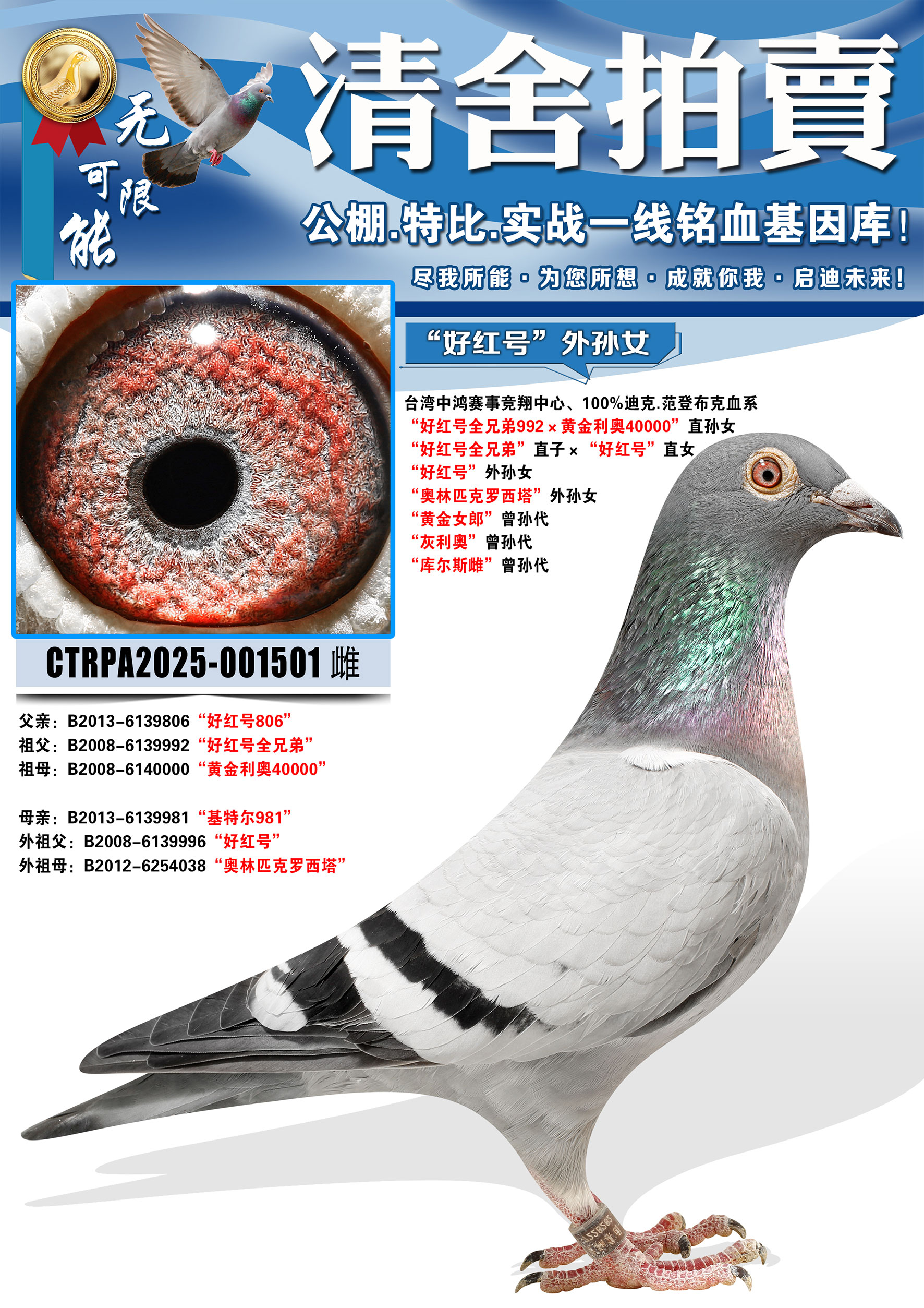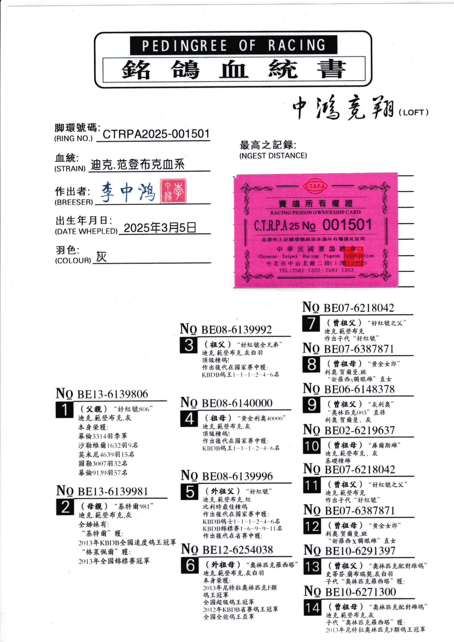 所有拍卖鸽全部血统真实!!个人鉴鸽观点不一,飞不飞天上见.血统成绩第一