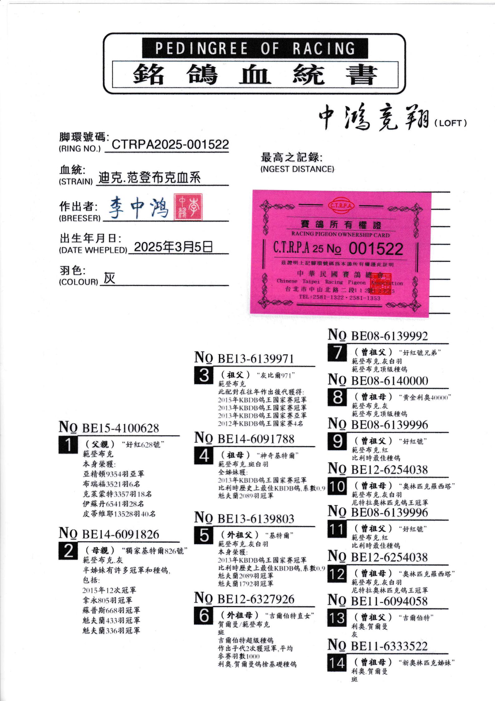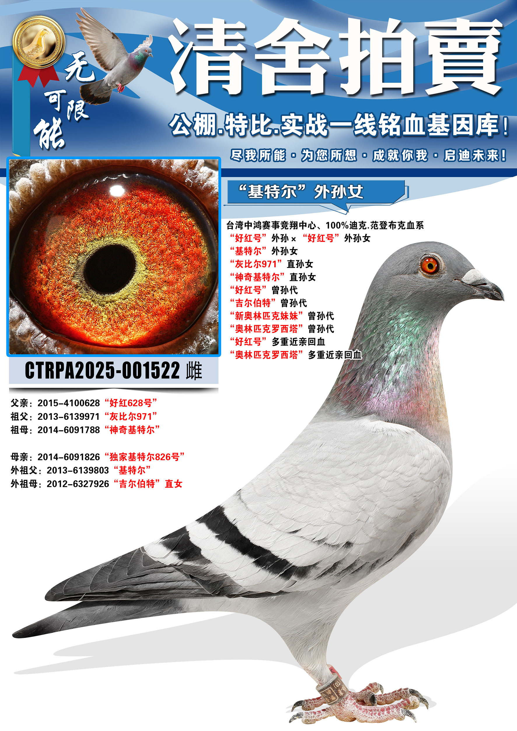 所有拍卖鸽全部血统真实!!个人鉴鸽观点不一,飞不飞天上见.血统成绩第一