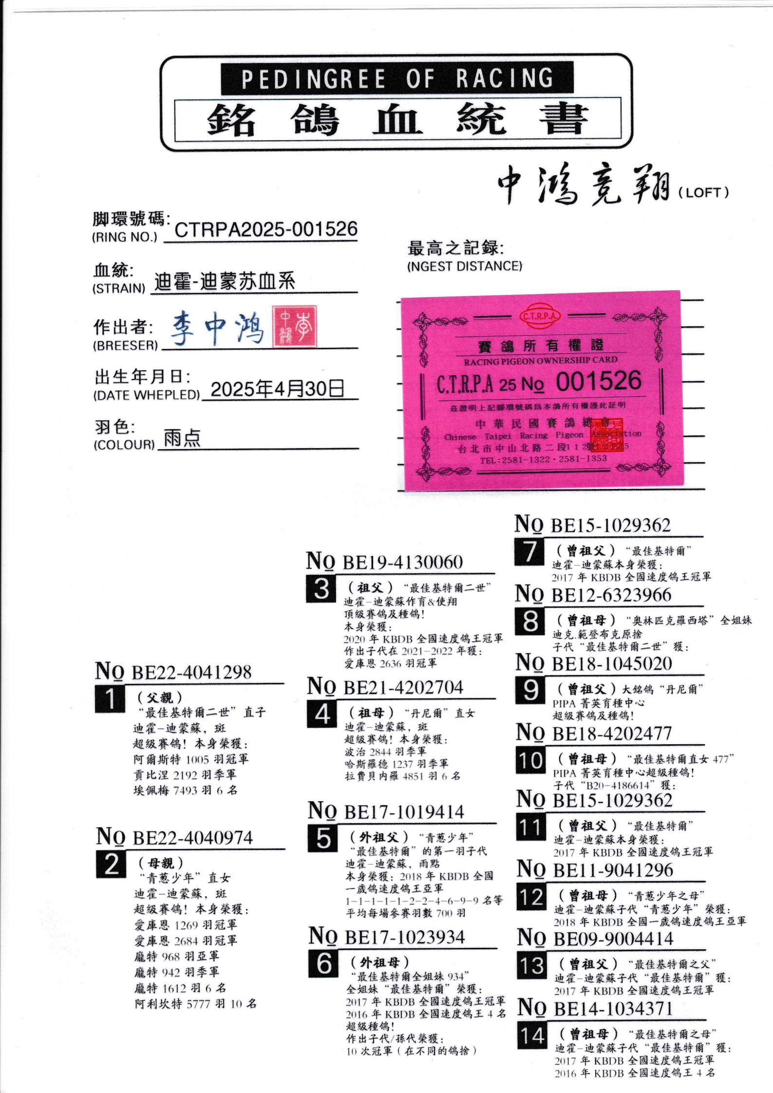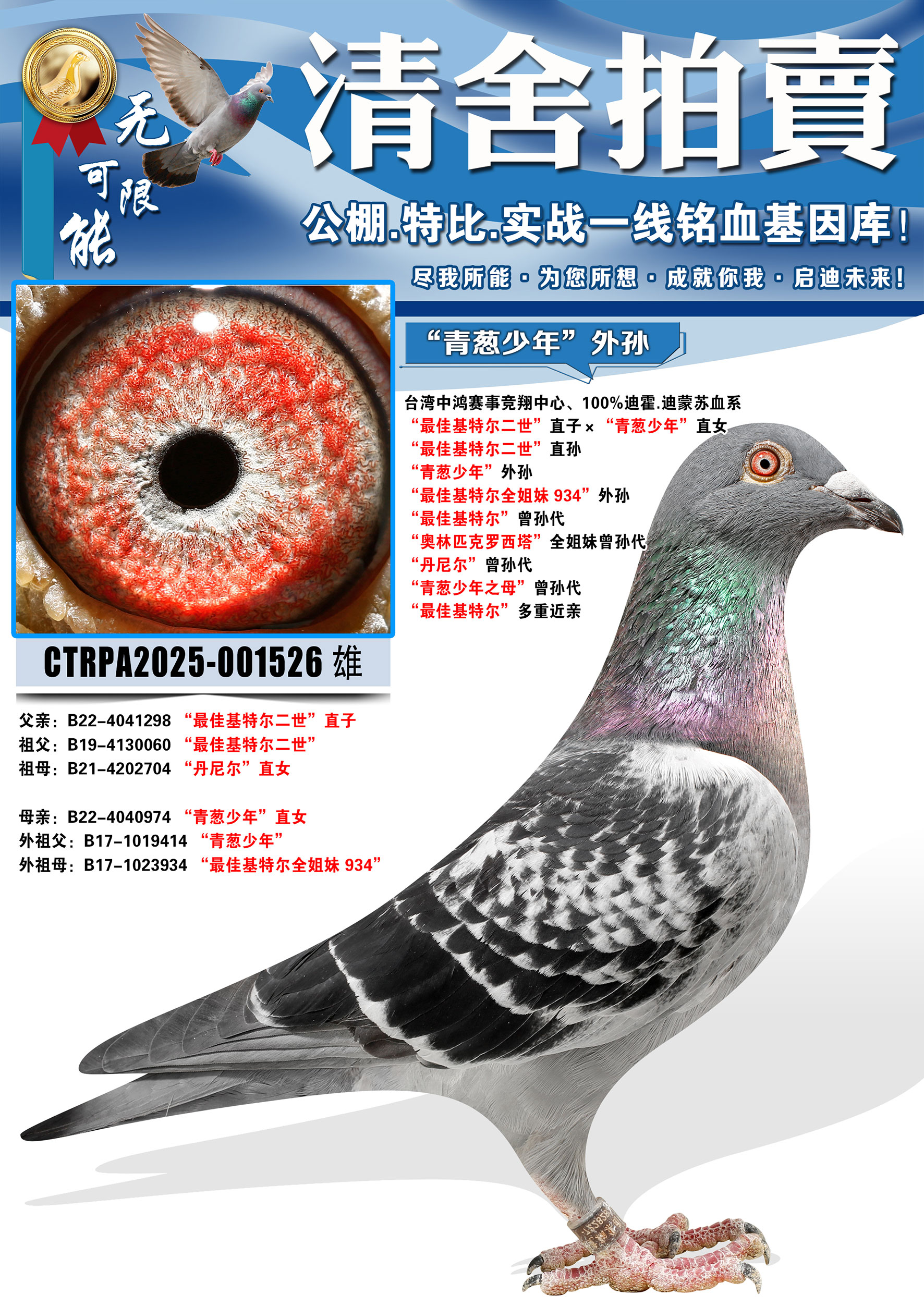 所有拍卖鸽全部血统真实!!个人鉴鸽观点不一,飞不飞天上见.血统成绩第一