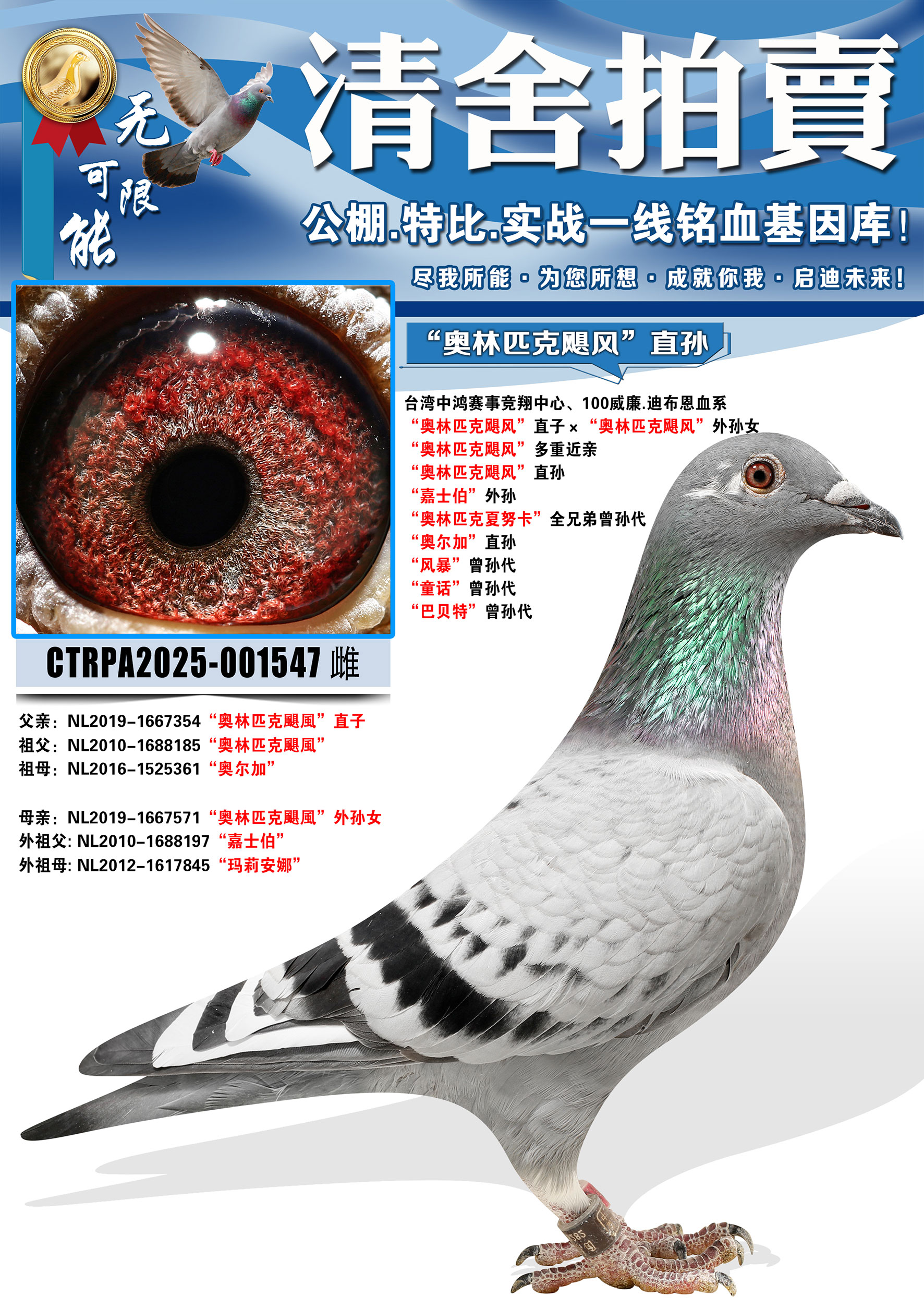 所有拍卖鸽全部血统真实!!个人鉴鸽观点不一,飞不飞天上见.血统成绩第一