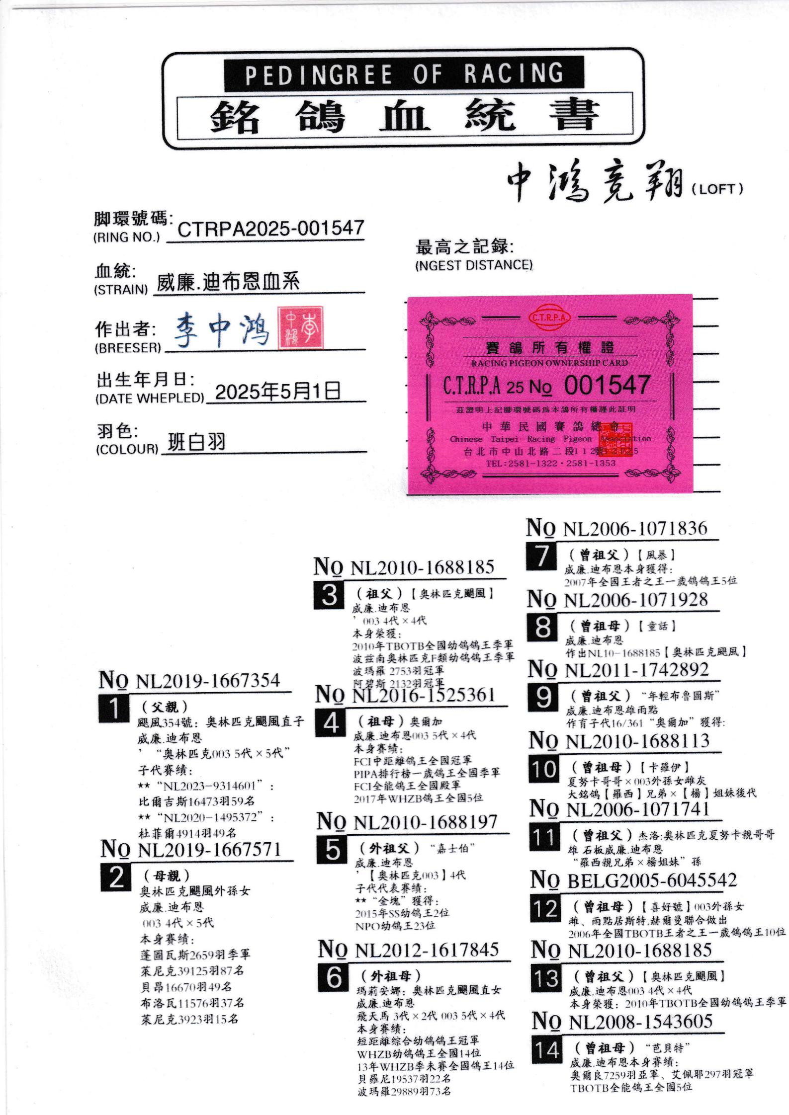 本身赛绩:2006年全国TBOTB王者之王一岁鸽鸽王10位