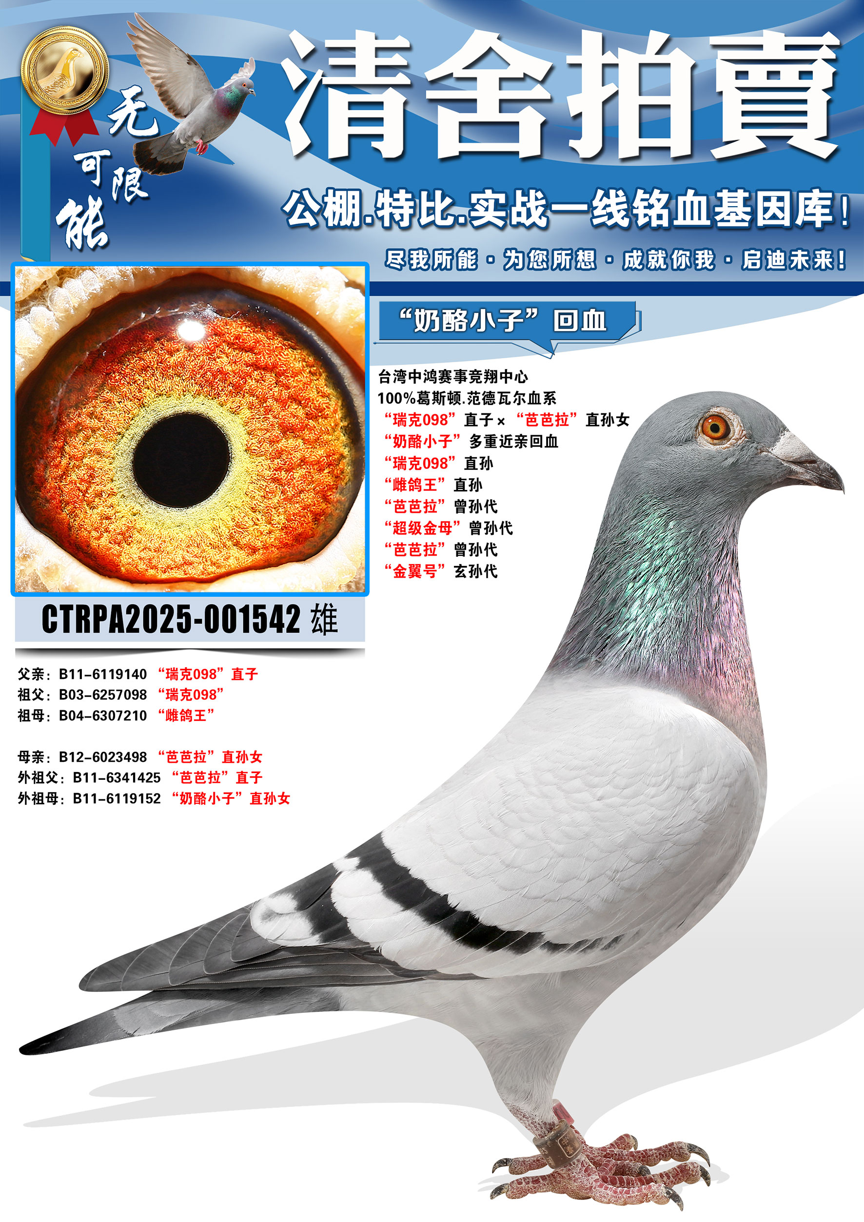 所有拍卖鸽全部血统真实!!个人鉴鸽观点不一,飞不飞天上见.血统成绩第一