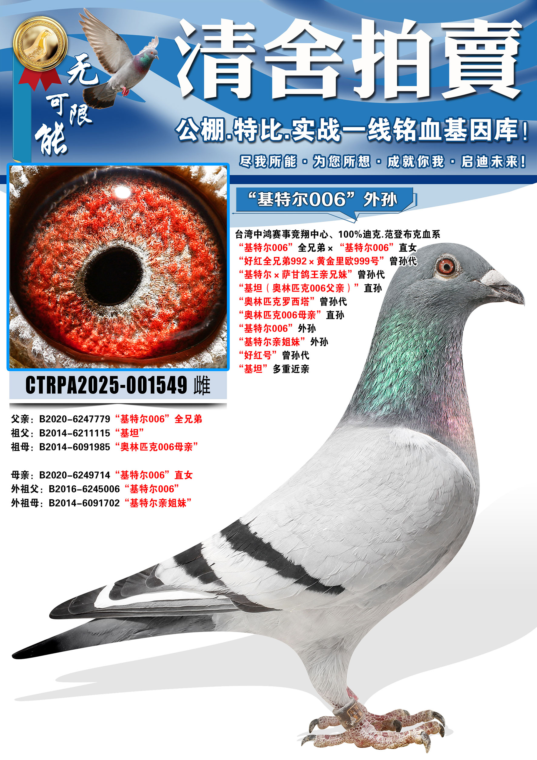 所有拍卖鸽全部血统真实!!个人鉴鸽观点不一,飞不飞天上见.血统成绩第一