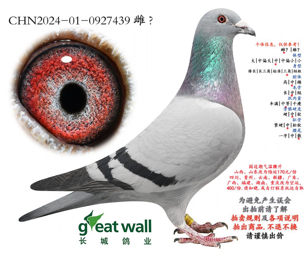 因拍卖鸽均是未做育过的种鸽或幼鸽,图内所标雌雄仅供参考,实际性别已实物为准。不做退换理由。