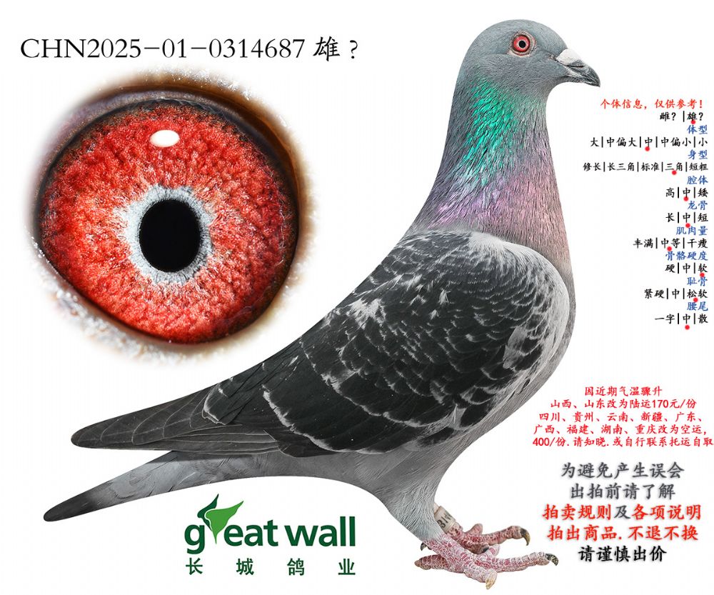 因拍卖鸽均是未做育过的种鸽或幼鸽,图内所标雌雄仅供参考,实际性别已实物为准。不做退换理由。