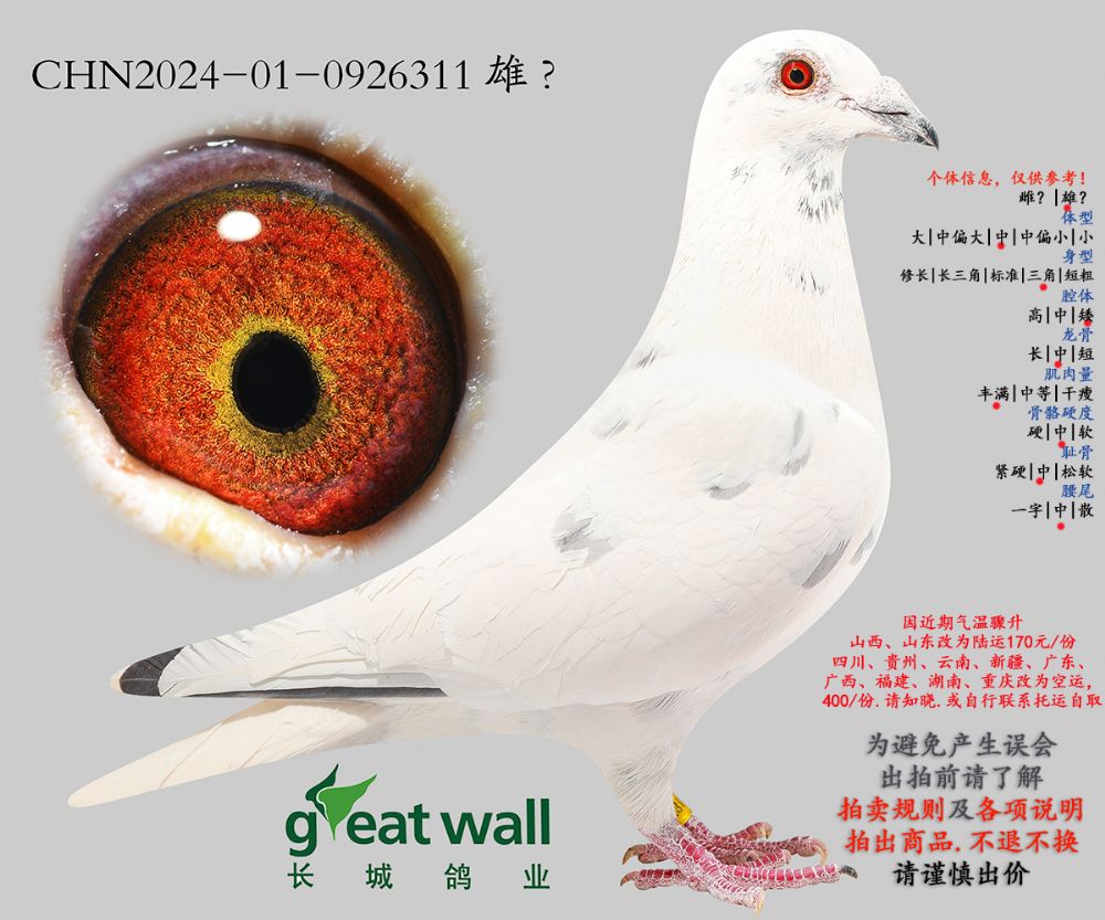 因拍卖鸽均是未做育过的种鸽或幼鸽,图内所标雌雄仅供参考,实际性别已实物为准。不做退换理由。