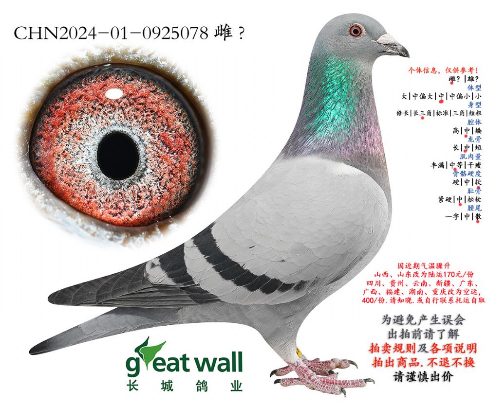 因拍卖鸽均是未做育过的种鸽或幼鸽,图内所标雌雄仅供参考,实际性别已实物为准。不做退换理由。