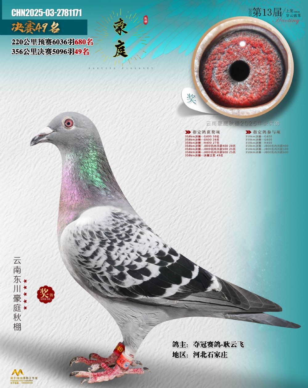 • 鸽主姓名:夺冠赛鸽-耿云飞