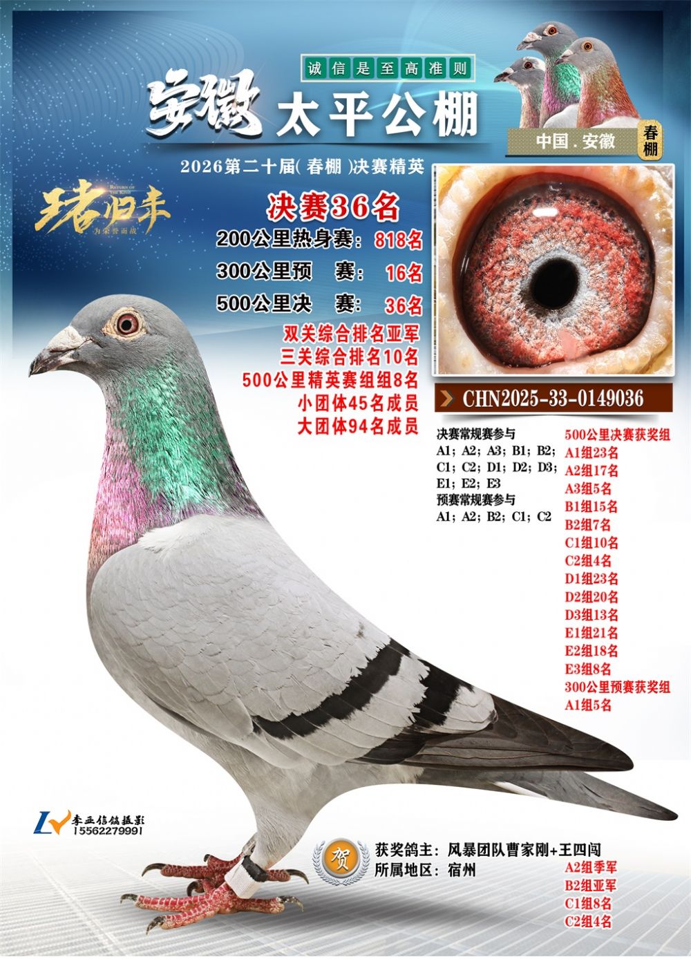 - 鸽主姓名:风暴团队曹家刚+王四闯