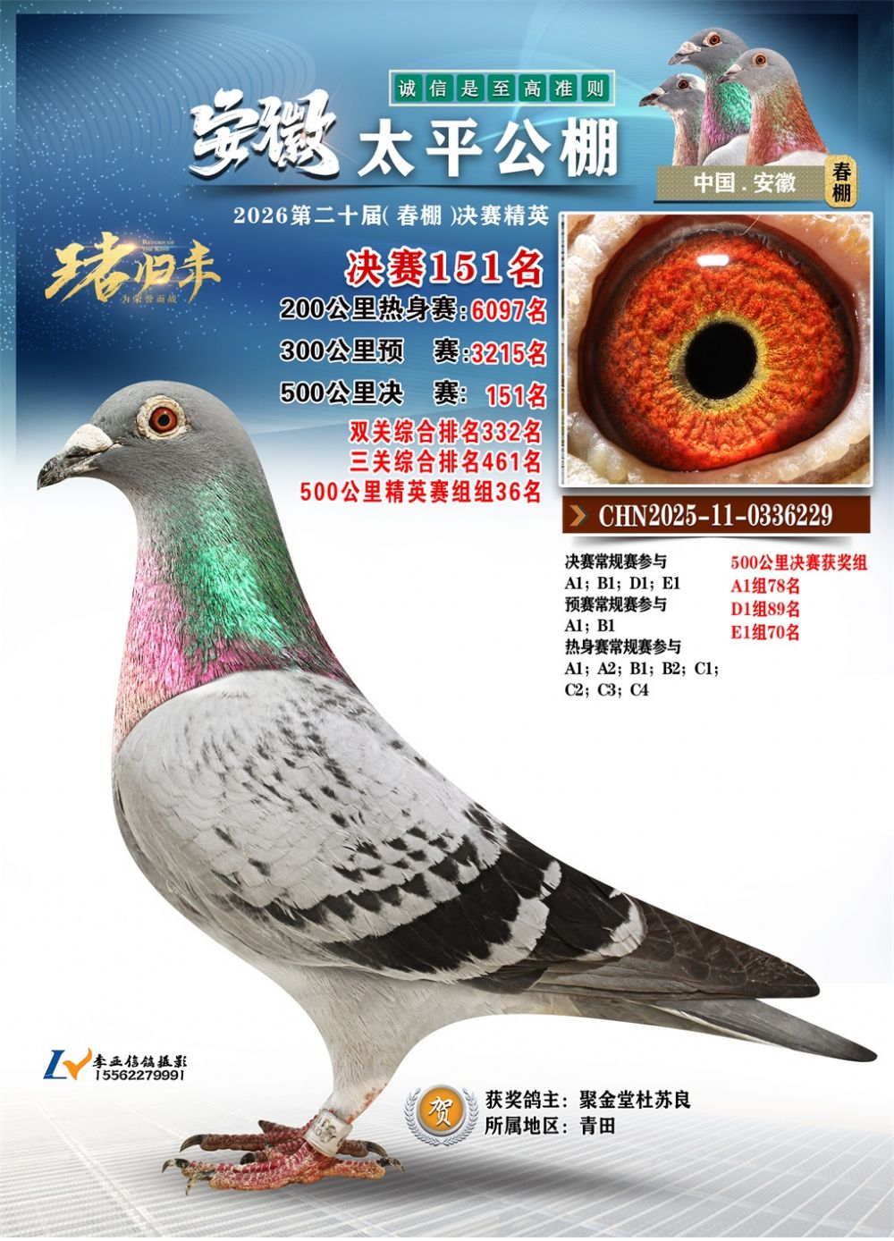 - 鸽主姓名:聚金堂杜苏良