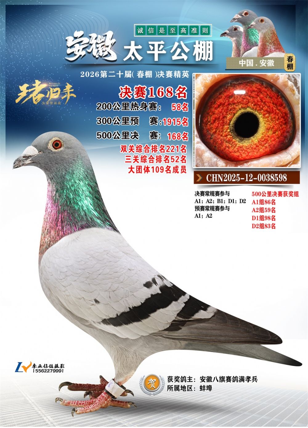 - 鸽主姓名:安徽八旗赛鸽满孝兵