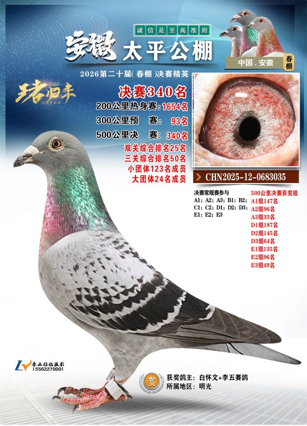- 鸽主姓名:白怀文+李五赛鸽