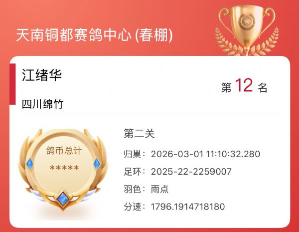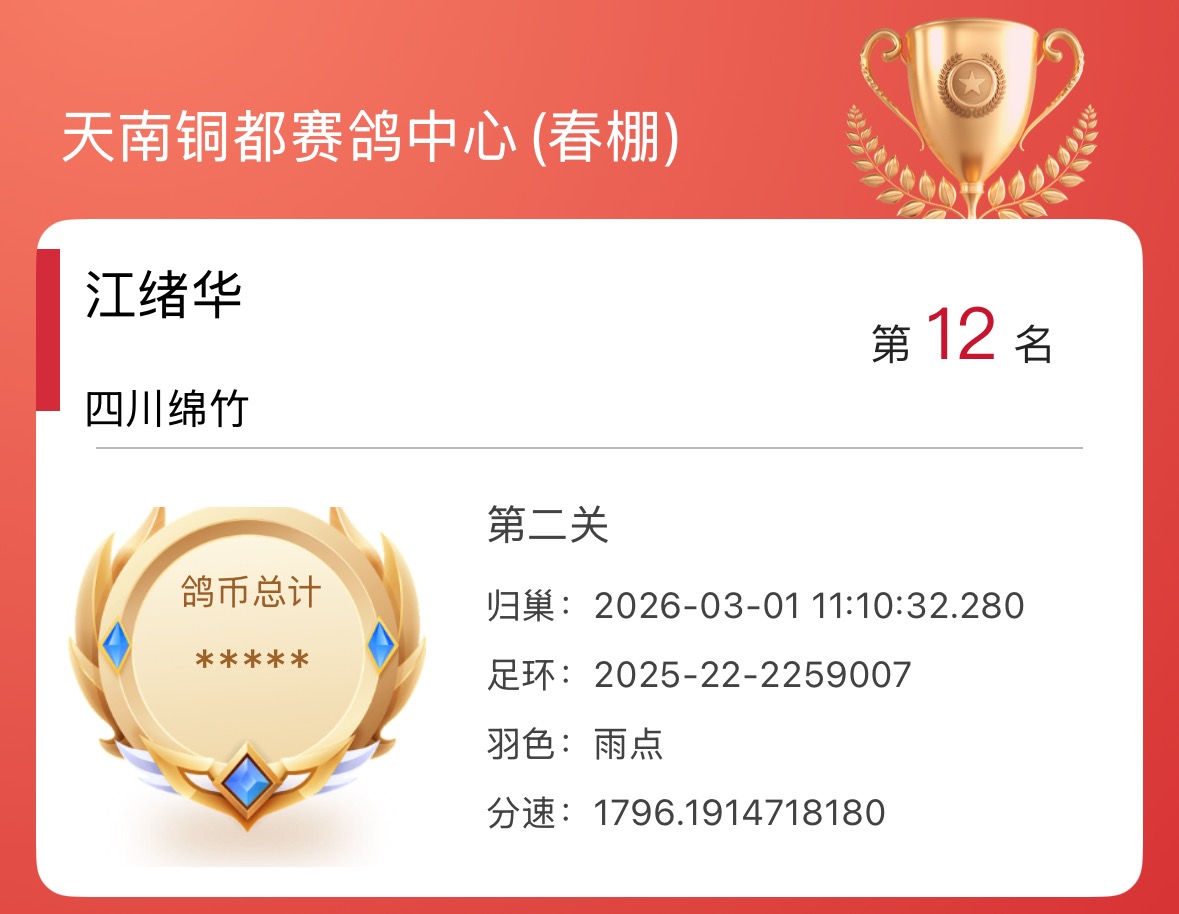 恭喜鸽友江绪华,天南铜都预赛以1796.19米/分与冠军同时归返斩获12名。