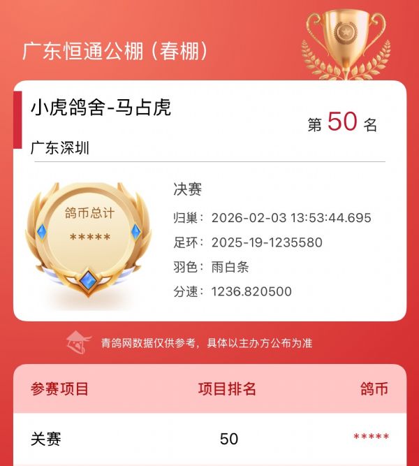 近亲繁育是优秀赛鸽向下遗传的核心密码,春赛战火重燃,两位鸽友使翔开尔近亲种鸽,分获赛航决赛30名、恒通决赛50名!