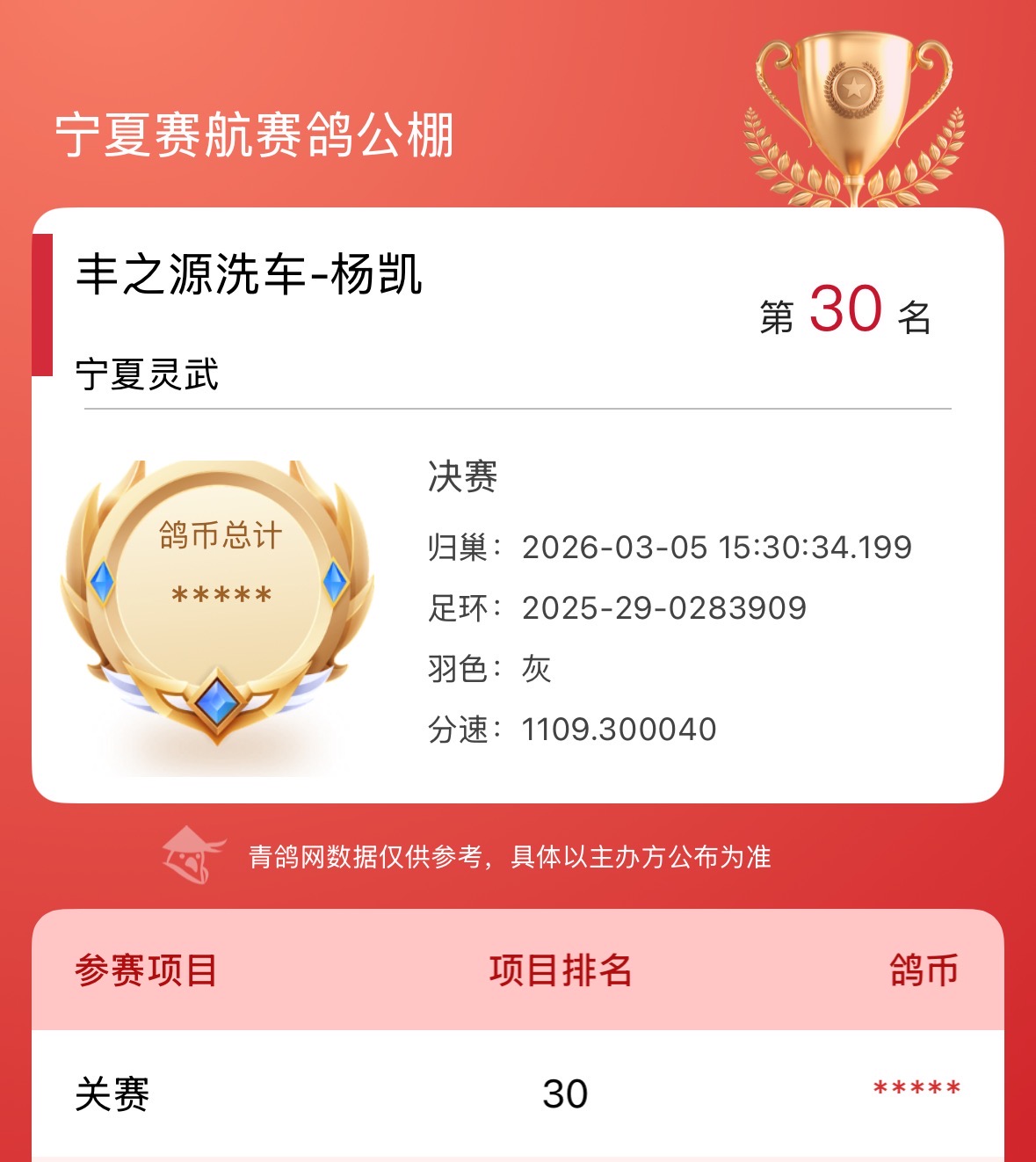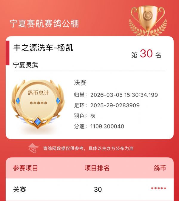 深厚的血脉根基,为鸽友杨凯铸就赛航决赛30名奠定了坚实基础。