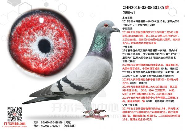 银影侠源于开尔经典配对阿恩与晚生灰雌,血统源自杨欧瓦克千万国王一脉。银影侠直接子代战绩辉煌:18年开创者四关鸽王5名,斩获总奖金3500万元、1辆劳斯莱斯、4辆奔驰;
