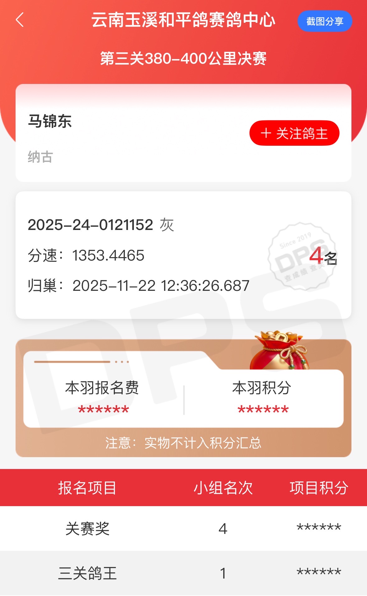 三关鸽王冠军!恭喜鸽友马锦东获云南玉溪和平鸽公棚决赛殿军,三关鸽王冠军,鸽王冠军父母均源自开尔。