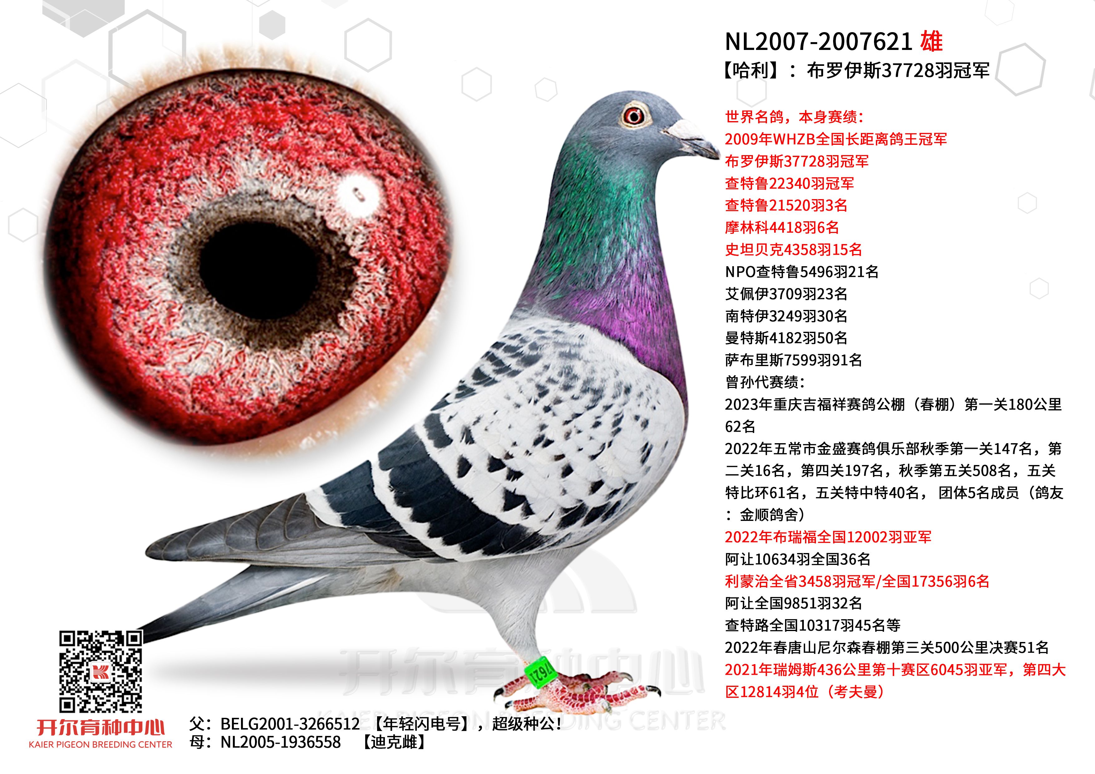 鸽王冠军是哈利的多重近亲,父亲出自哈利直子与查特路21201羽亚军萨瓦纳,母亲是哈利直子与直女的近亲作育。极度近亲回血,旨在将盖比精华提纯。