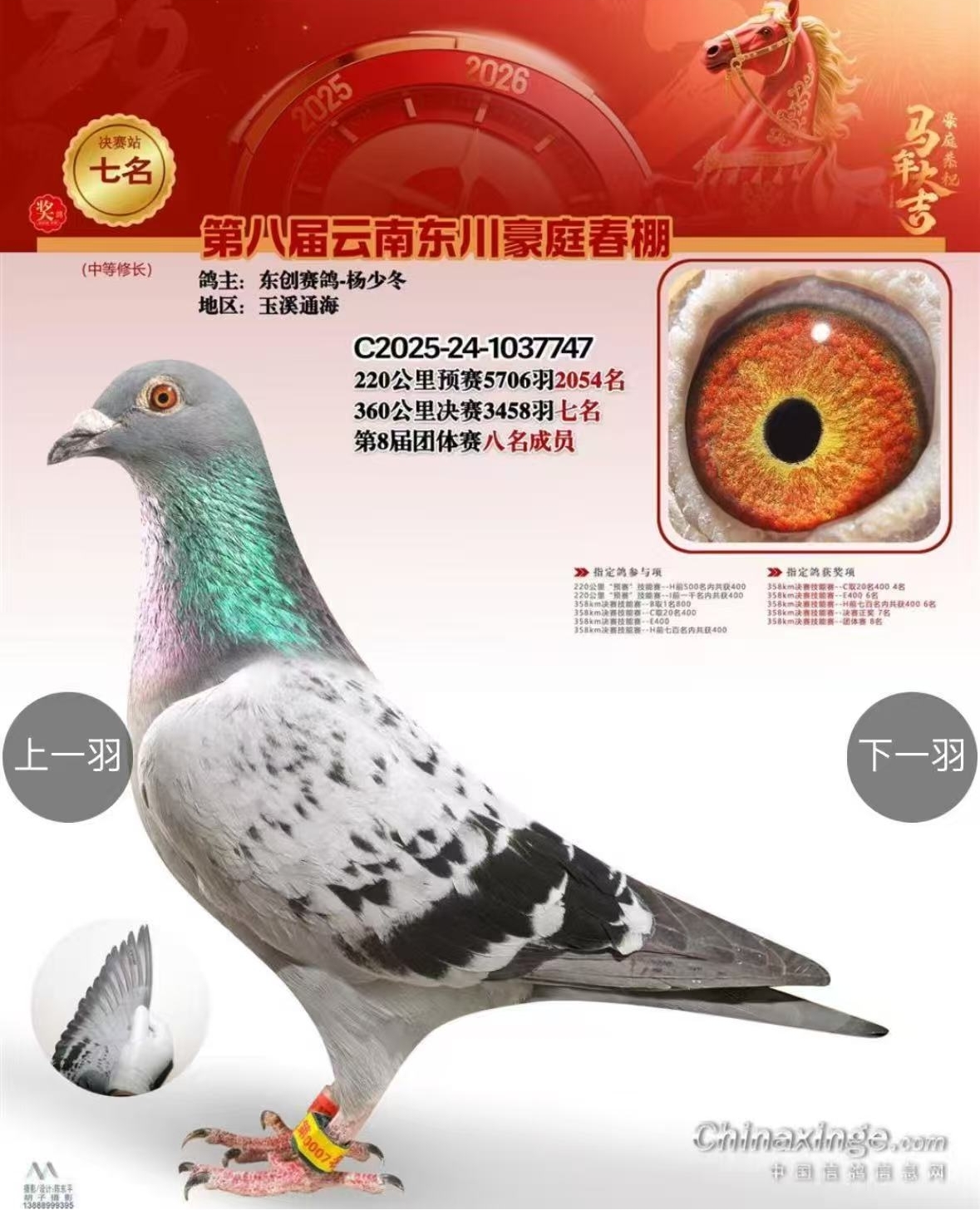 决赛7名!恭喜鸽友杨少冬,凭借开尔阿曼多近血赛鸽,获云南东川豪庭春棚决赛7名。