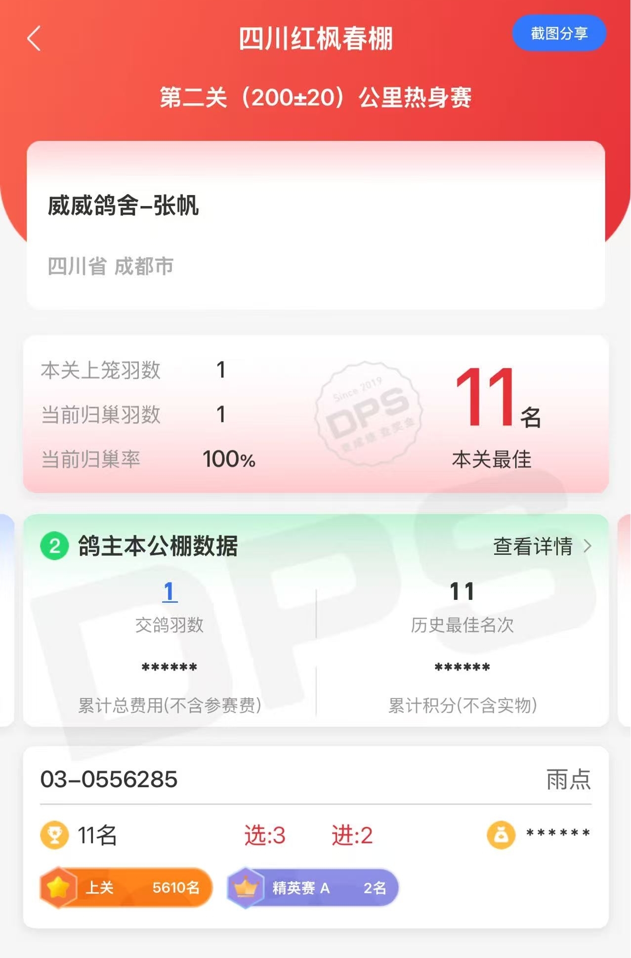 恭喜鸽友张帆,选用开尔幼鸽 0556285 直送红枫春棚,第二关热身赛斩获11 名,这羽赛将与冠军同批次归巢,与冠军失之交臂。