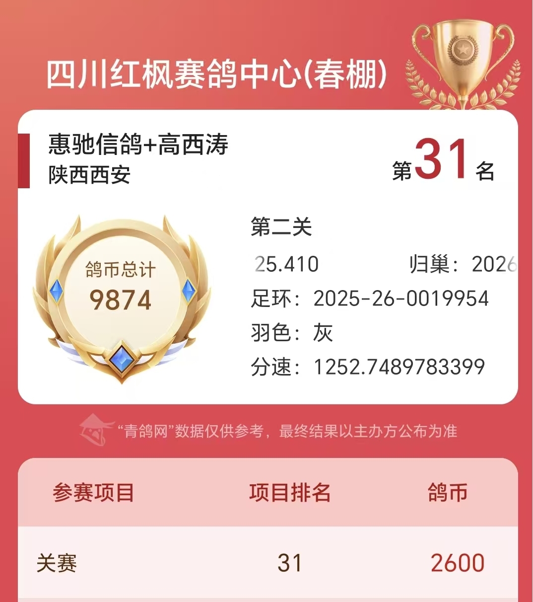 又是阿曼多!恭喜鸽友高西涛,获红枫第二关热身赛 31名,31名母亲801源自开尔阿曼多家族。
