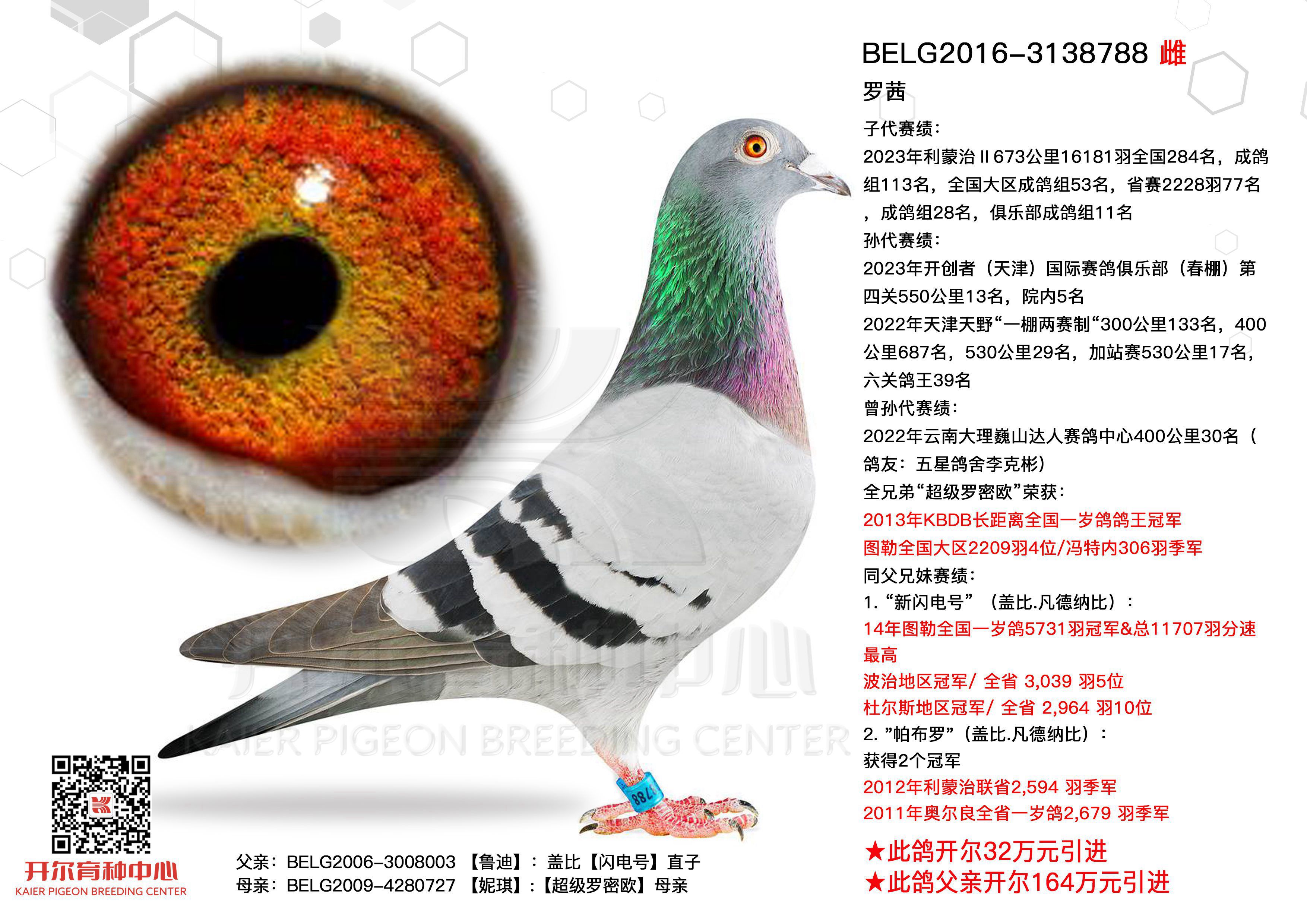 801的母亲是阿曼多与盖比的强强结合,由阿曼多与鲁迪女儿罗茜直接作育。更值得称道的是,除本场31名外,另有鸽友引进阿曼多幼鸽直送红枫参赛,一举拿下第二关11名。阿曼多血脉近来捷报频传,助力鸽友斩获 26年东川豪庭决赛358公里7名,25年开尔青年队决赛冠军;开尔钻石队第二关亚军,25年阳光大棚精英赛13名等高位奖项。