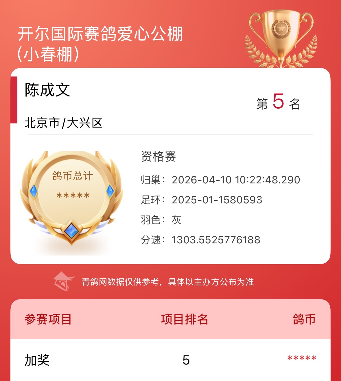 除此之外,鸽友陈成文引进的阿曼多血脉同样表现亮眼:24年获神州辉煌资格赛冠军,25年再夺北国之春302公里9名。