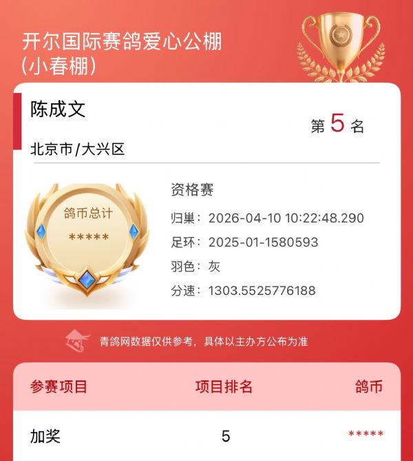 再次祝贺鸽友陈成文!愿开尔铭血继续助力,在更多赛场上披荆斩棘,再攀高峰!