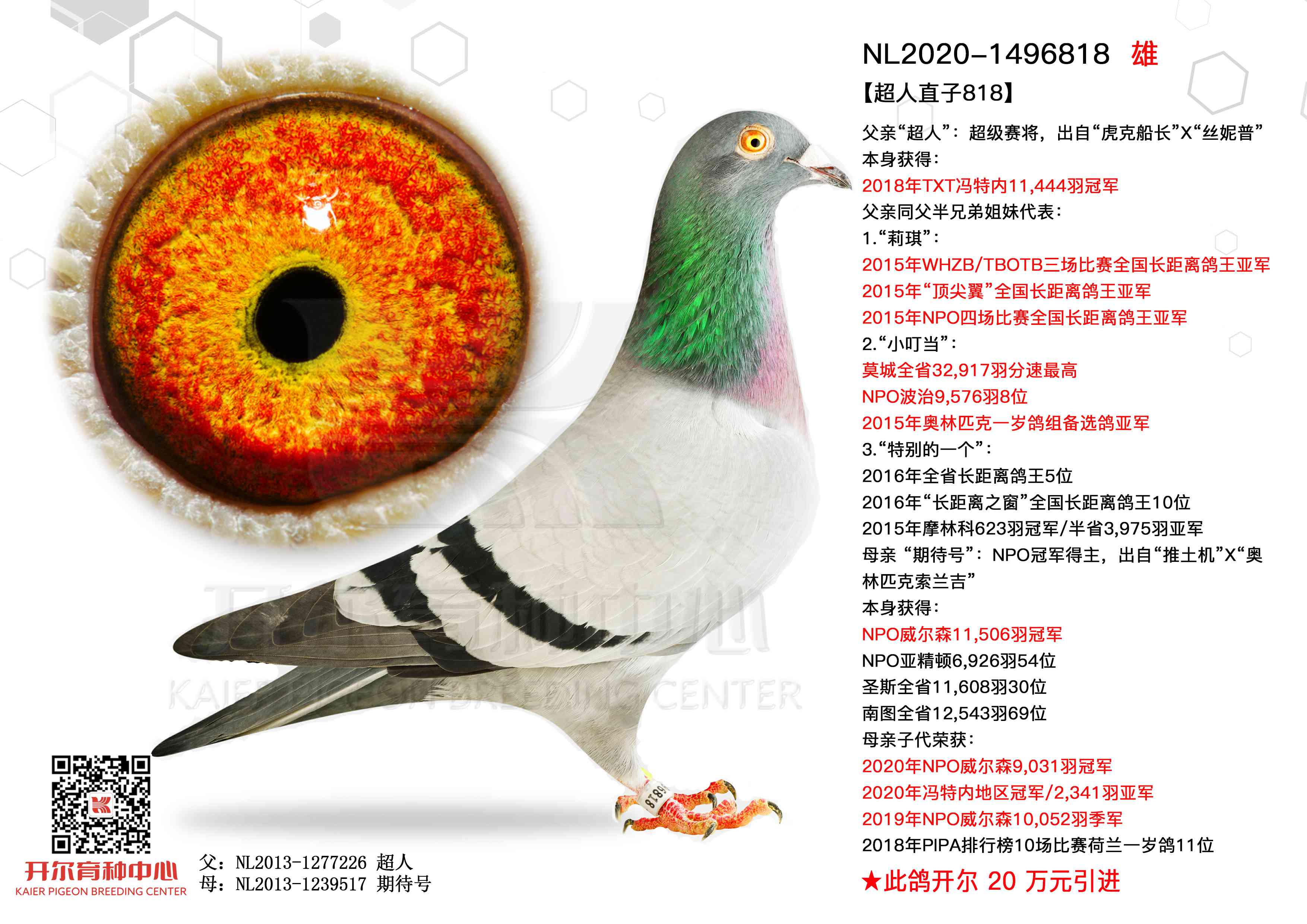 5名母亲源自开尔魔法家族,由11444羽冠军超人与11506羽冠军期待号作育的超人双冠王,结合22年阳光精英赛7名育出,底蕴深厚。