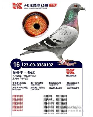 新金姆表姐妹“直孙”赛绩鸽 23-09-0380155 江苏爱翔公棚23年秋季加强赛39名。 浏览量:2053 次 [详细介绍] [询价]