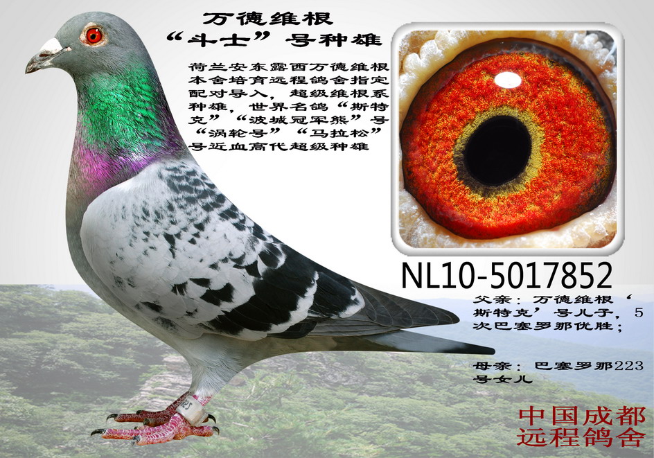 父亲:远程现役主力种雄万德维根“斗士号”公,源自荷兰安东露西万德维根本舍,入种后第一年就育出700公里当日归,后代发挥稳定;