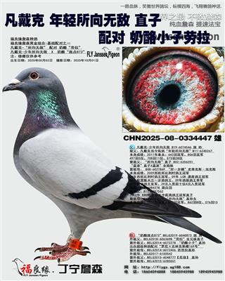 CHN2025-08-0334447 父:凡戴克-少年所向无敌 B19-6074546 斑 砂 祖父:凡戴克当今铭鸽“年轻所向无敌”B11-6240267 祖母:B18-6084278 斑白羽 母:“奶酪斑点873”BELG2019-6040873 斑 黄 外祖父:BELG2018-6063698“劳拉”全兄妹直子 外祖母:BELG2017-6150542
