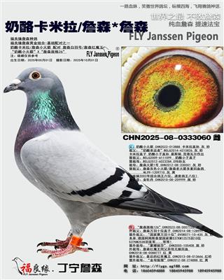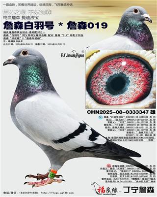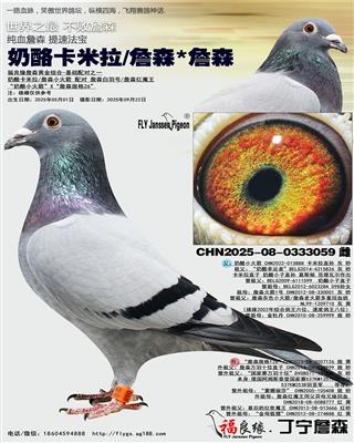 CHN2025-08-0333054 父:詹森“耐翔号”CHN2023-08-0068629 灰 砂 祖父:CHN2022-08-0081111 斑 砂 鸽王282直子 祖母:CHN2022-08-0081702 灰 黄 奶酪小子回血 母:“奶酪778”CHN2023-08-0068778 灰 砂 外祖父:CHN2019-08-0267777 奶酪小子多重回血 外祖母:“奶酪白翼”BELG2017-605...