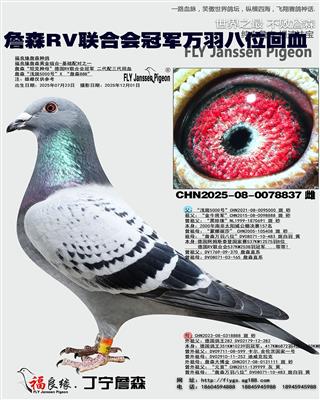 CHN2025-08-0078837 父:“浅斑5000号”CHN2021-08-0095000 斑 砂 祖父:“金牛将军”CHN2015-08-0098888 斑 砂 祖母:“詹森万羽八位”DV08071-10-483 斑白羽 黄 母:CHN2023-08-0318888 斑 砂 外祖父:德国鸽王282 DV02179-12-282 外祖母:詹森大博金 CHN2017-08-0131111 斑 砂