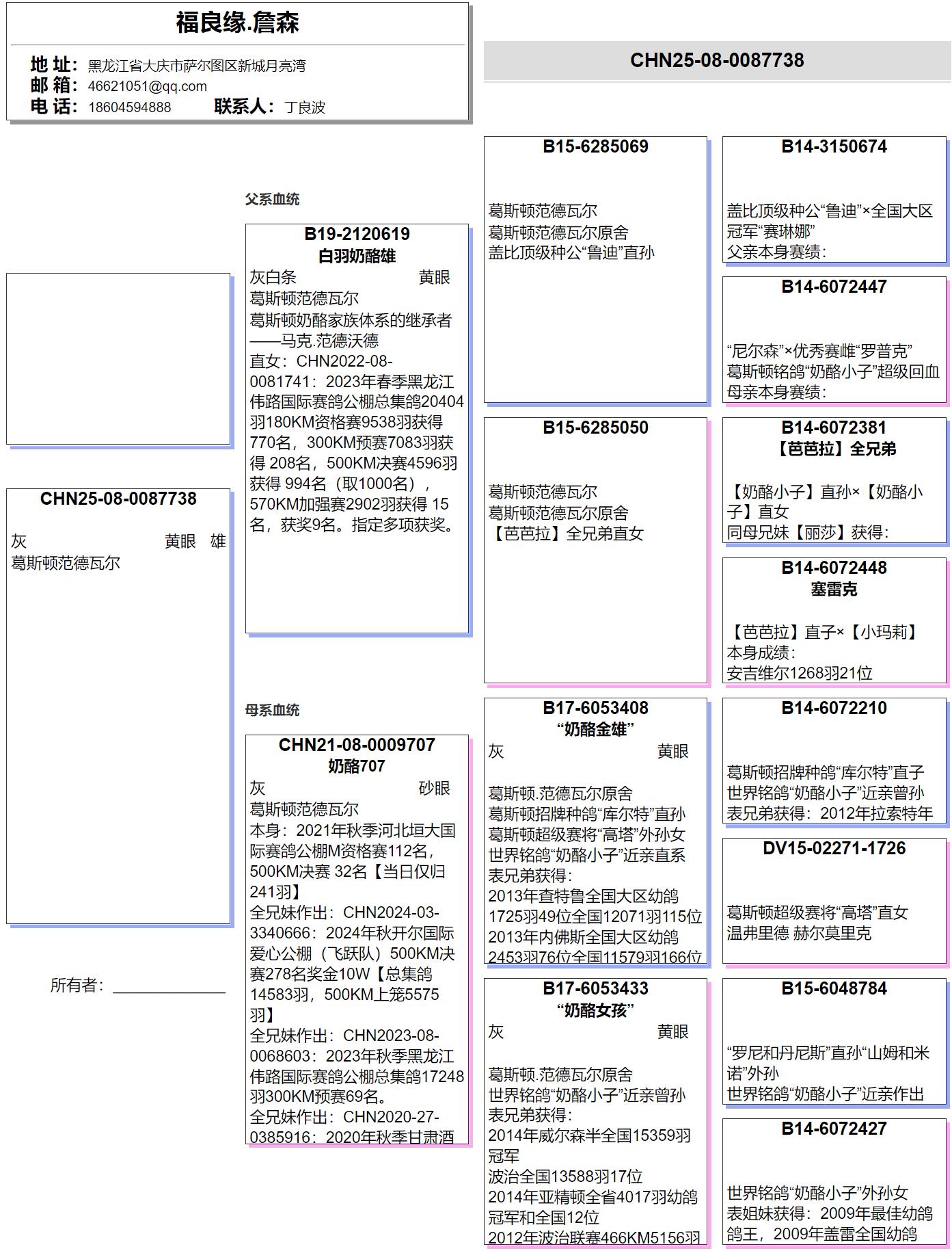曾外祖母:B14-6072427 世界铭鸽“奶酪小子”外孙女