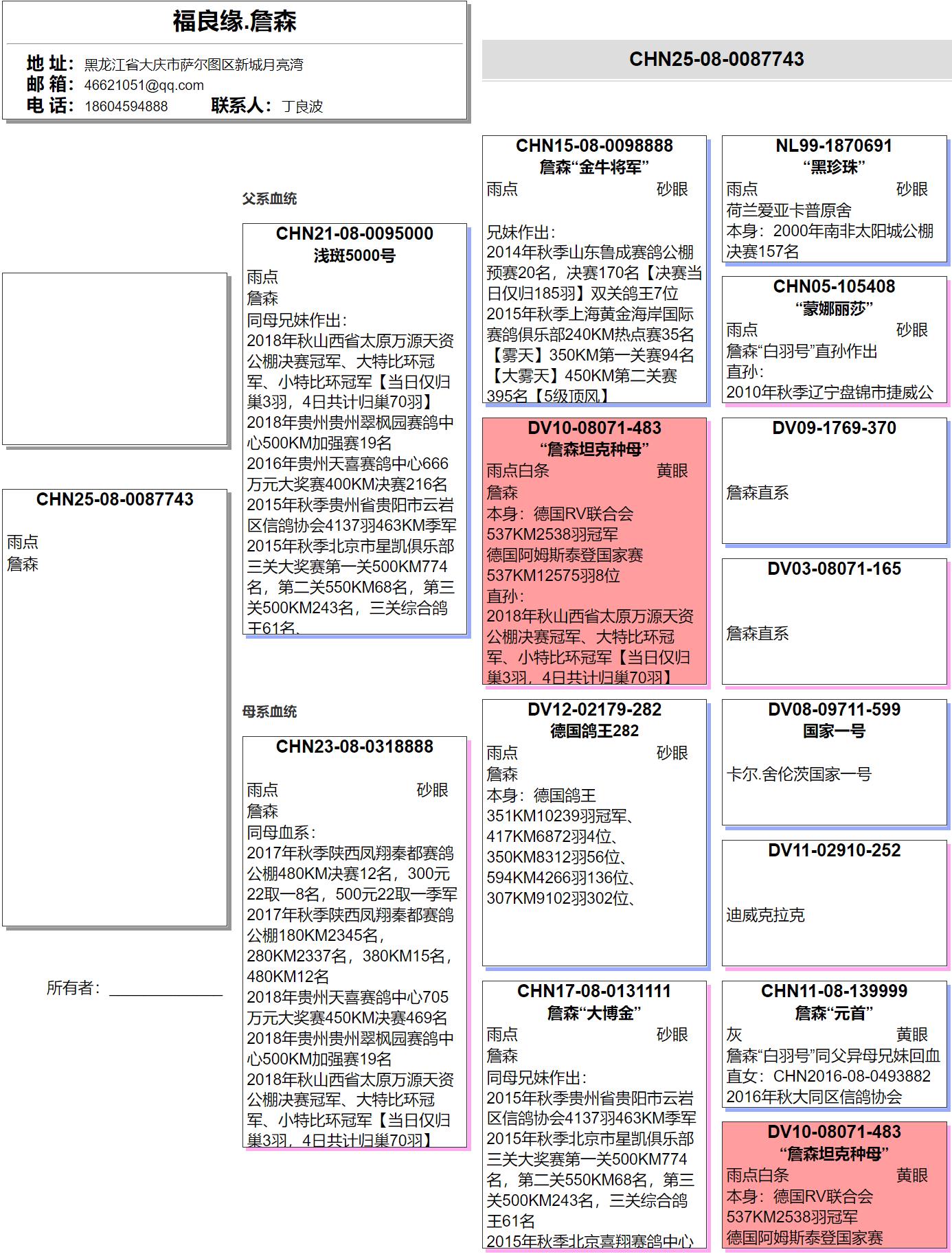 本身:德国鸽王351KM10239羽冠军、417KM6872羽4位、350KM8312羽56位、594KM4266羽136位、307KM9102羽302位、