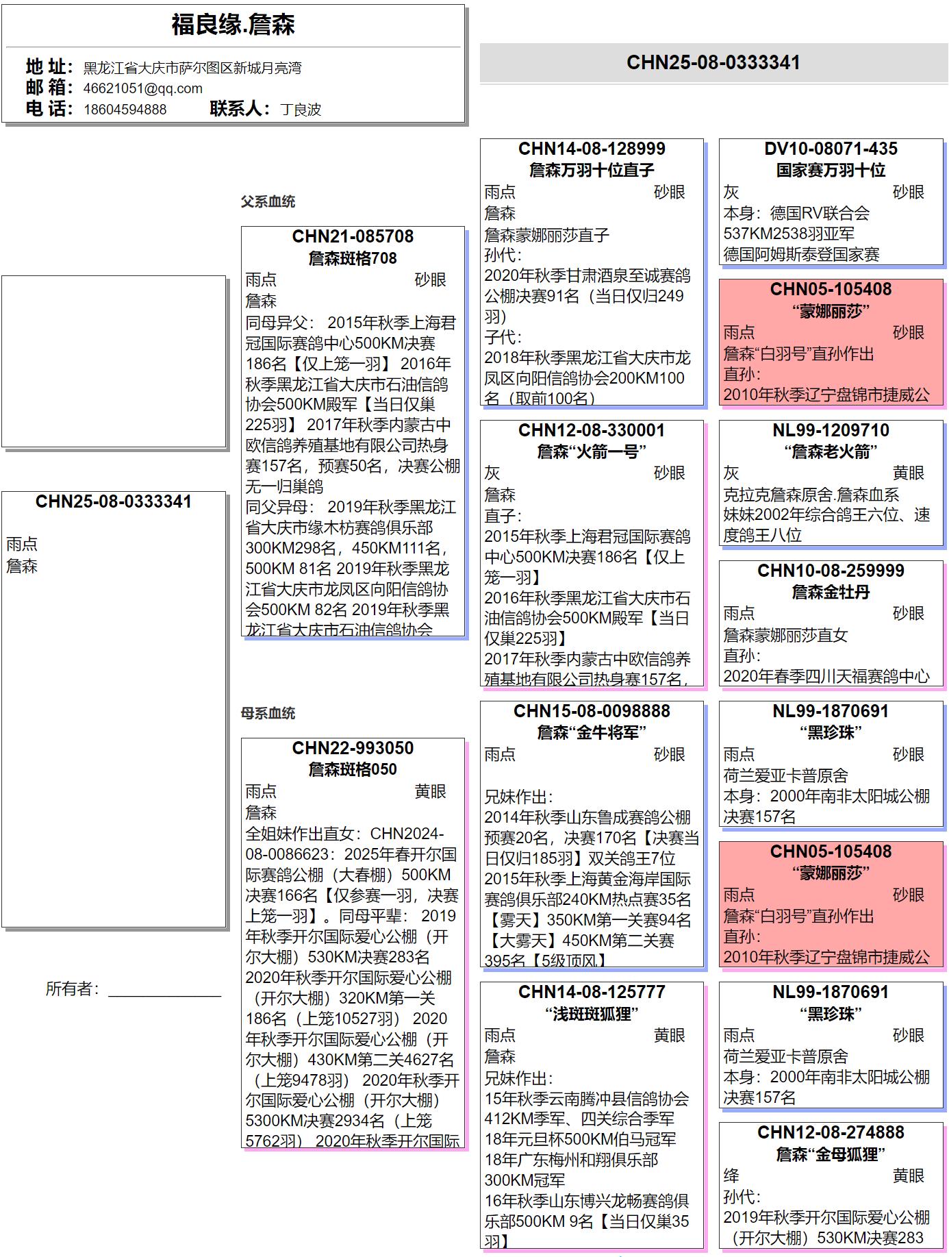 父:詹森“斑格708”CHN2021-08-085708 斑 砂 白羽号回血