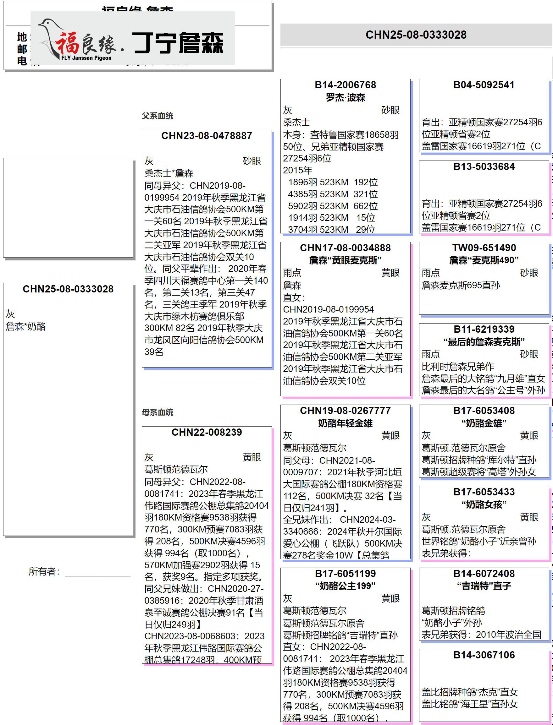 曾外祖母:B14-3067106 盖比招牌种鸽“杰克”直女 |